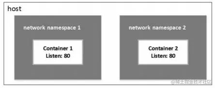 说到network namespace,它在Linux内核2.6版本引入,作用是隔离Linux系统的设备,以及IP地址、端口、路由表、防火墙规则等网络资源。因此,每个网络namespace里都有自己的网络设备(如IP地址、路由表、端口范围、/proc/net目录等)。从网络的角度看,network namespace使得容器非常有用,一个直观的例子就是:由于每个容器都有自己的(虚拟)网络设备,并且容器里的进程可以放心地绑定在端口上而不必担心冲突,这就使得在一个主机上同时运行多个监听80端口的Web服务器变为可能,如图1-1所示。