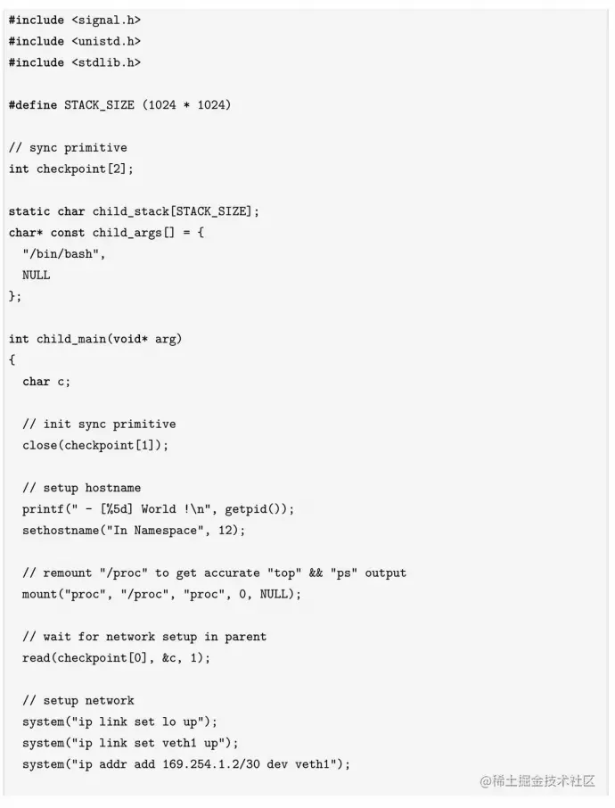 一个使用Linux network namespace相关系统调用的程序样例如下。由于代码比较简单,而且几个关键点都做了注释,笔者就不逐行解释了。