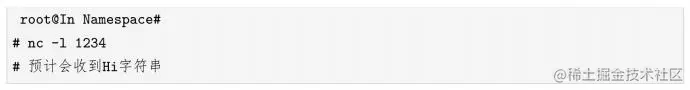 进入这个新的namespace中,使用nc -l 1234命令监听0.0.0.0:1234。然后打开另一个终端,输入以下命令: