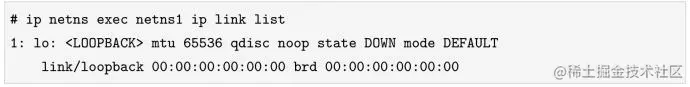 如上所示,就是进入netns1这个network namespace查询网卡信息的命令。目前,我们没有任何配置,因此只有一块系统默认的本地回环设备lo。