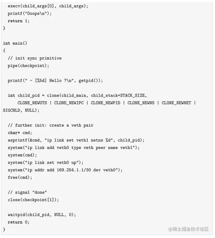 用户可以使用clone ()系统调用创建一个namespace。但当知道clone ()系统调用是用来创建一个新的进程时,请不要感到惊讶,让我们看下面的例子。