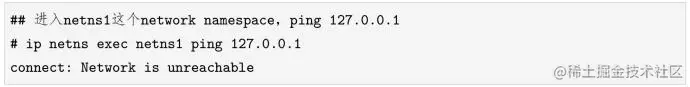 另外,不同network namespace之间的路由表和防火墙规则等也是隔离的,因此我们刚刚创建的netns1 network namespace没法和主机共享路由表和防火墙,这一点通过下面的测试就能说明。