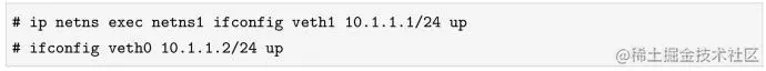 如上所示,我们创建了veth0和veth1这么一对虚拟以太网卡。在默认情况下,它们都在主机的根network namespce中,将其中一块虚拟网卡veth1通过ip link set命令移动到netns1 network namespace。那么,veth0和veth1之间能直接通信吗?还不能,因为这两块网卡刚创建出来还都是DOWN状态,需要手动把状态设置成UP。这个步骤的操作和上文对lo网卡的操作类似,只是多了一步绑定IP地址,如下所示: