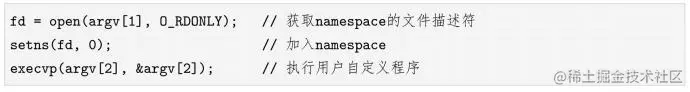 我们已经使用一些黑科技使得namespace即使没有进程在其中也能保持开放。接下来,我们就要往这个namespace里“扔”进程,Linux系统调用setns ()就是用来做这个工作的,其主要功能就是把一个进程加入一个已经存在的namespace中。setns ()的定义如下所示: