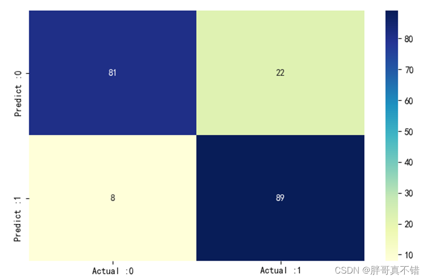 从上图可以看出,实际为0预测不为0的 有8个样本;实际为1预测不为1的 有22个样本,整体预测准确率良好。