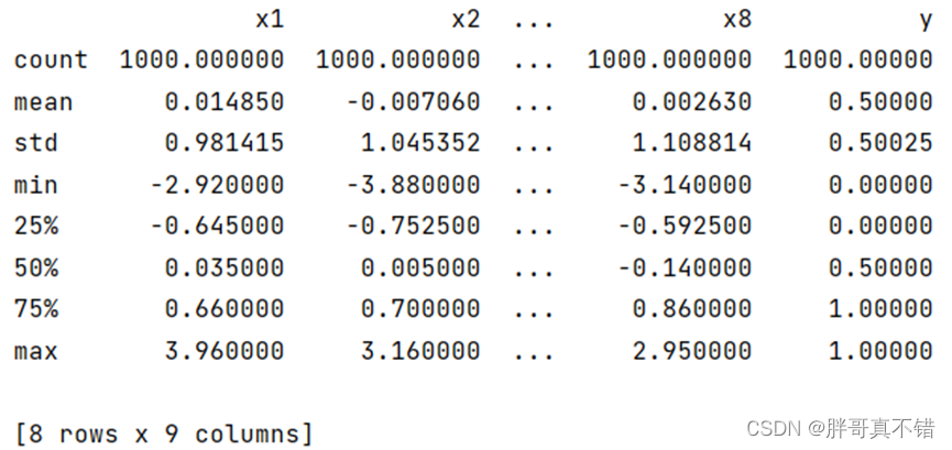 通过Pandas工具的describe()方法来查看数据的平均值、标准差、最小值、分位数、最大值。