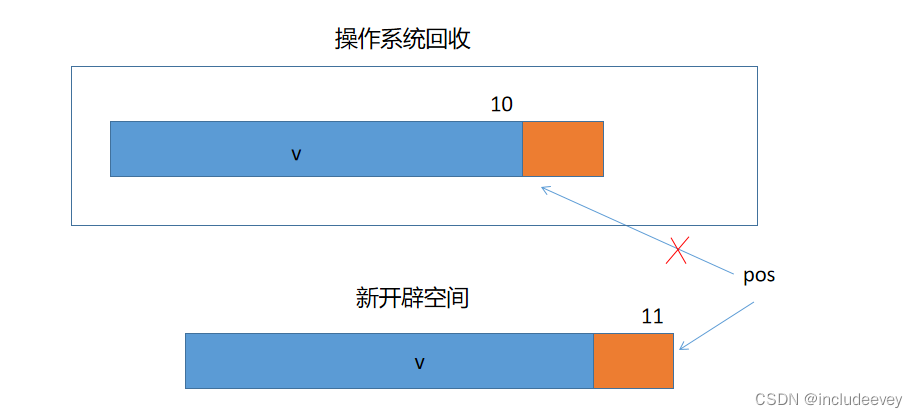 在模拟实现insert的时候会发生迭代器失效,迭代器失效实则就是扩容引起的野指针问题,实现insert有种特殊情况。当我们插入一个数据的时候,该数组是没有空间需要开辟空间,当开辟空间后pos如果不更新的话,还是指向的是原来的地址,那么当开辟后这个地址是会被操作系统回收,pos就会发生野指针的问题。
