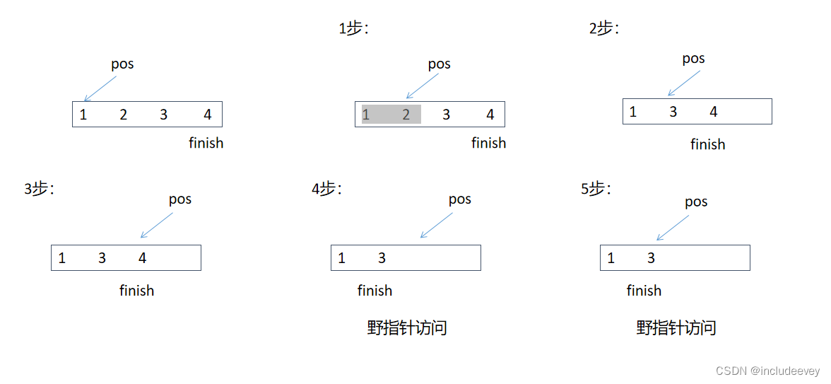 下面代码用pos查找所找3位置的iterator,然后删除pos位置的数据,再去访问。这一例子就好比刻舟求剑一样。