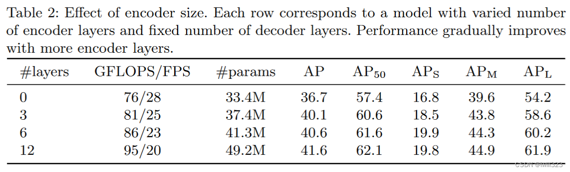 #params、GFLOPS、FPS 分别表示了模型了参数量、计算量和推理速度。DETR模型参数量、GFLOPS更小,但是推理更慢。可能是由于硬件对于不同结构的优化程度有差异。目前来看, CNN 在同样网络规模甚至更大网络规模下,推理速度比 Transformer 更快。