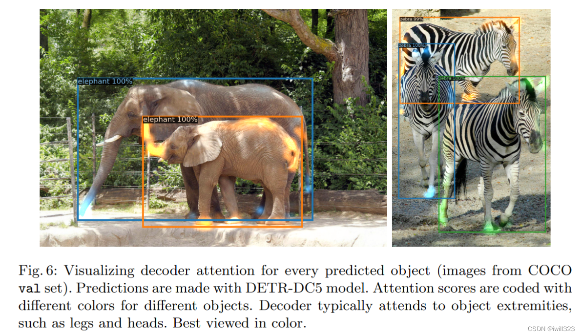 下图在 Decoder 特征中对不同的物体做了注意力的可视化,比如左图中的两头大象分别由蓝色和橙色表示。可以观察到,Decoder 网络中对于每个物体的注意力都集中在物体的边界位置,如大象的鼻子、尾巴、象腿等处,另外DETR依然能够区分出每个斑马的轮廓并学到各个目标的条纹。作者认为这是 Decoder 在区分不同物体边界的极值点(extremities),encoder学一个全局的特征,让物体之间尽可能分得开,Decoder关注不同物体边界的具体位置,最终精准地预测出不同物体的边框位置。