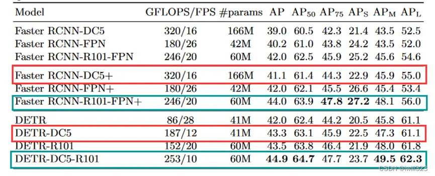 最上面一部分的 Faster RCNN 的性能结果是 Detection2 的实现,之所以将 Faster RCNN 分成两部分,是因为 DETR 中使用了近年来很多新的训练 trick,如 GIoU loss、更强的数据增强策略、更长的训练时间,因此作者团队添加这些策略重新训练了 Faster RCNN,以作公平的对比。