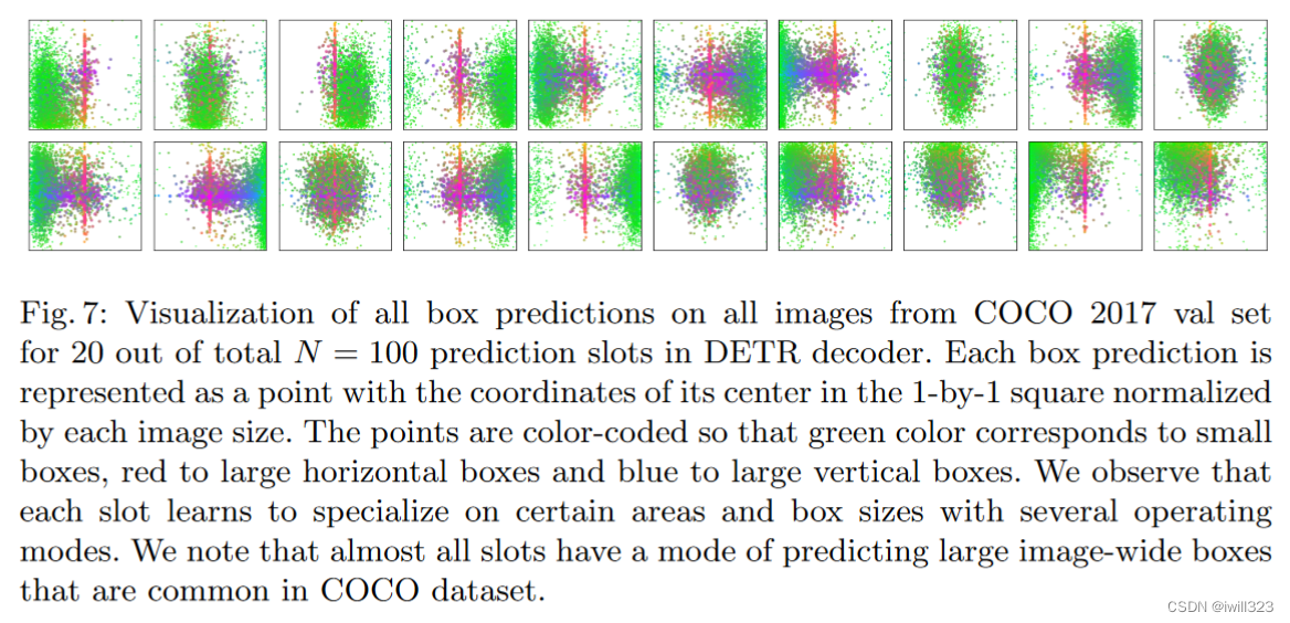 上图展示了 COCO2017 验证集中所有的预测框关于 learned object query 的可视化。者将100个object query中20个拿出来,每个正方形代表一个object query,每个点表示的是一个预测框的归一化中心坐标。每个object query相当于一个问问题的人,绿色的点表示小框、红色的点表示大的横向的框、蓝色的点表示大的纵向的框。