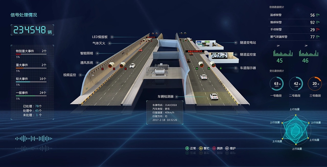 数维图智慧隧道是基于数字孪生理念,通过三维可视化的手段将隧道的整体结构、设备分布情况进行立体化呈现,具有透彻感知、全面互联、深度整合、智能服务等特点,智慧隧道可视化系统实时呈现隧道内车辆、路况、事故等信息,并实时监测交通违禁情况和环境数据,使得问题定位更为精准。同时还结合智慧隧道的关键运营指标,对隧道内的安全风险进行预警,及时推送应急处置方案。系统可根据安全风险情况,自动推荐处置预案,指导用户按照预案执行一步步操作,解决风险。隧道内外的多维数据联动和分析,使得安全预警的准确性非常高,大大降低了拥堵和事故的发生频率,进一步提高智慧隧道的安全风险防控能力。