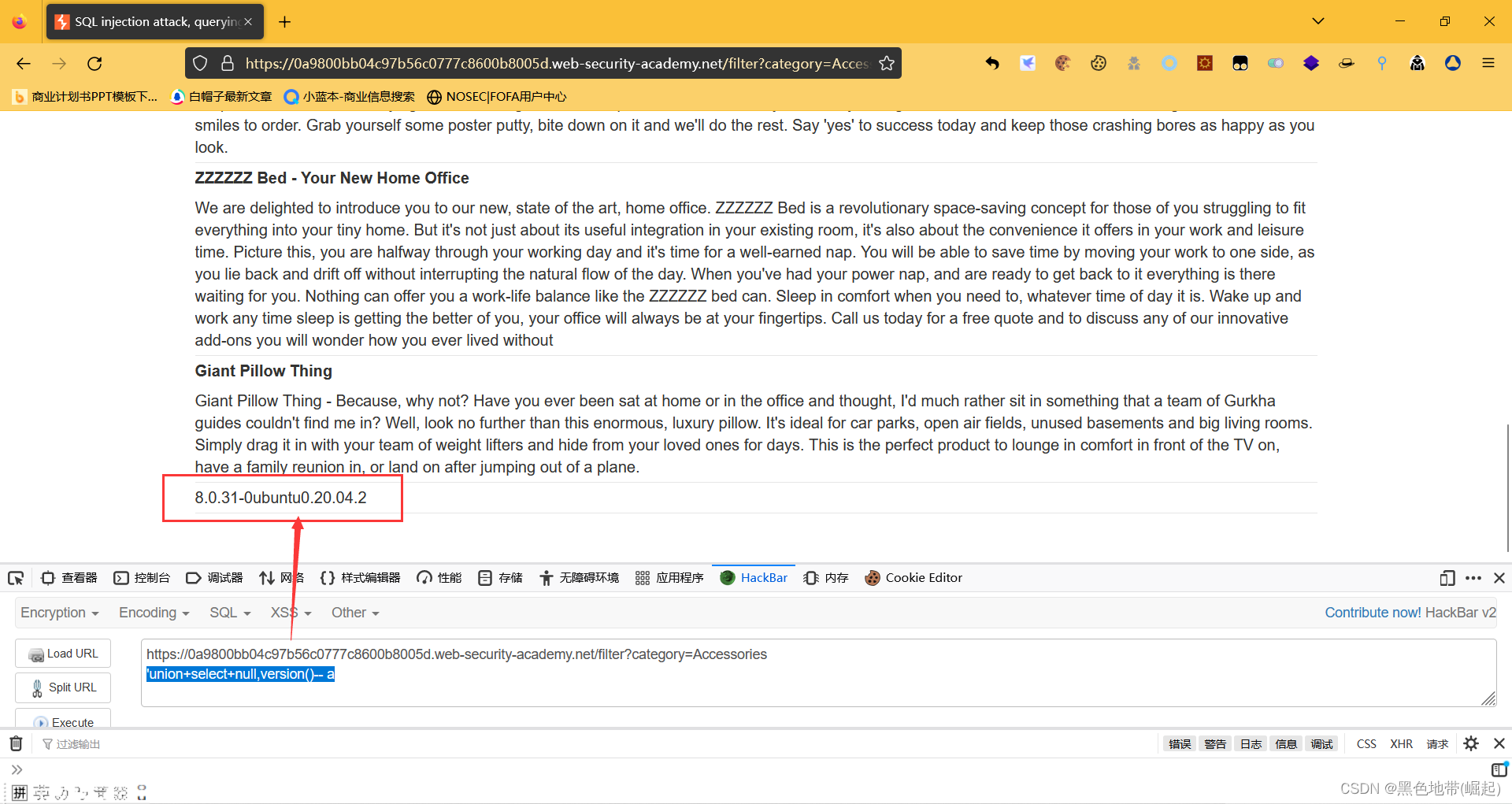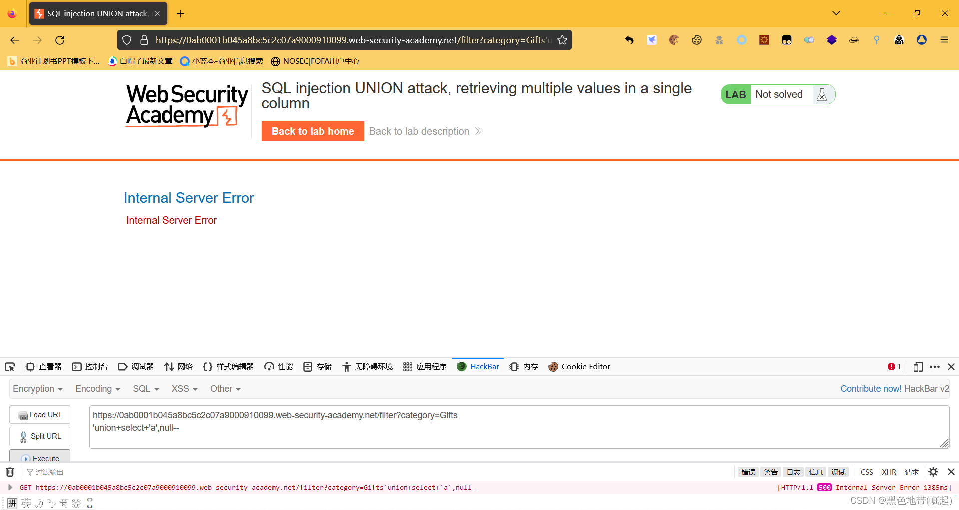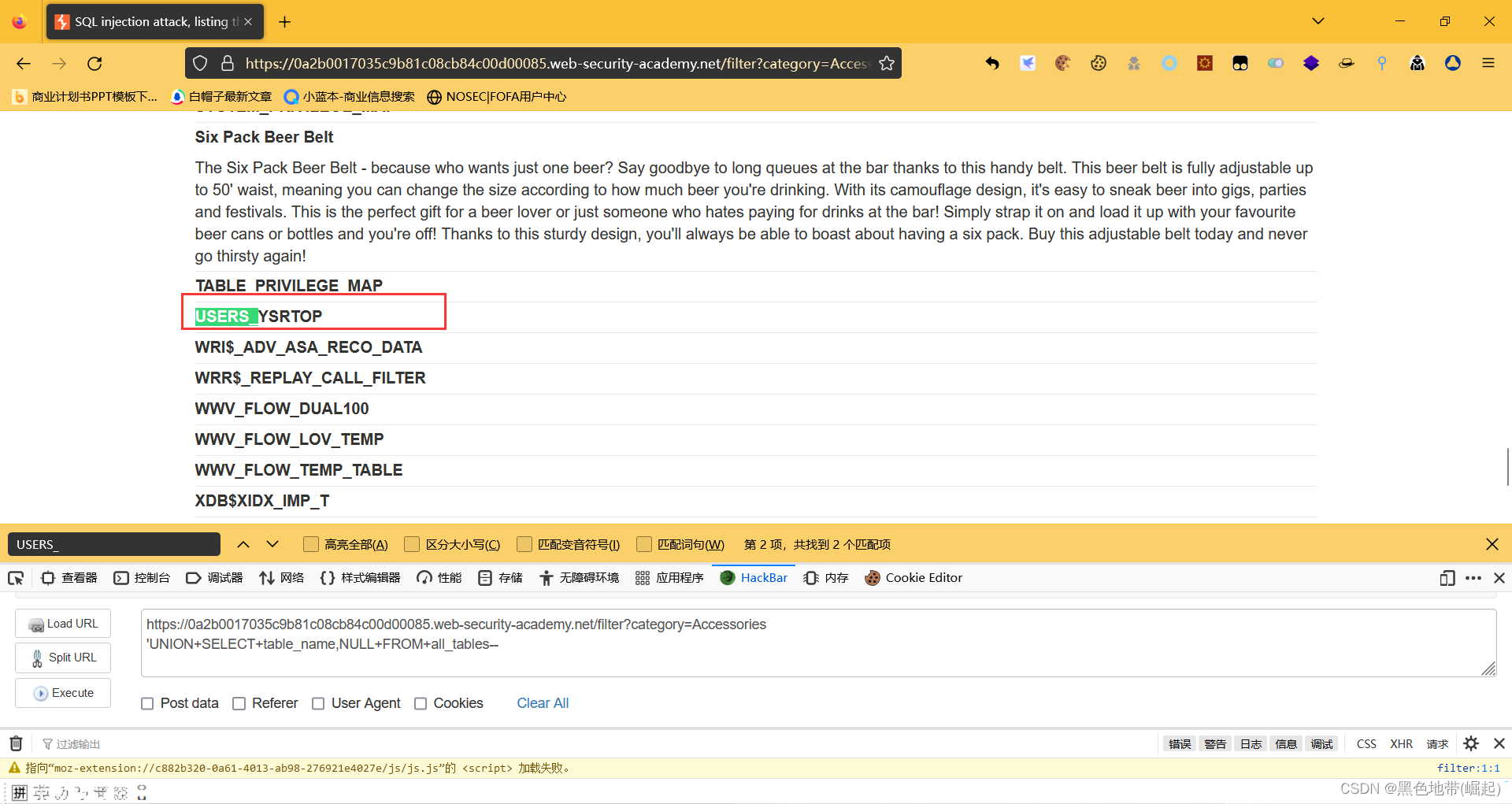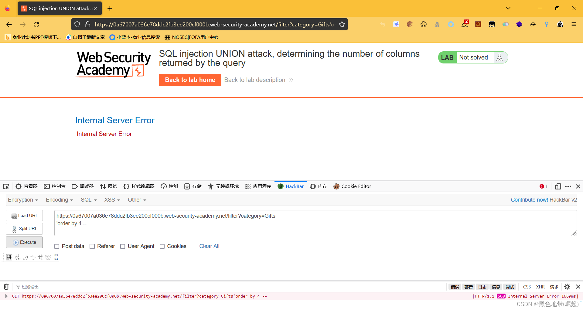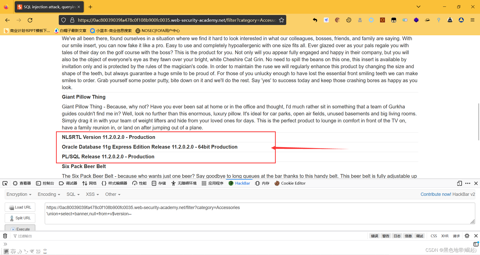 示例: 如果 SQL 查询的结果在应用程序的响应中返回,攻击者可以利用 SQL 注入漏洞从数据库中的其他表中检索数据。这是使用关键字完成的,该关键字允许您执行其他查询并将结果追加到原始查询。UNIONSELECT 例如,如果应用程序执行以下包含用户输入“礼物”的查询: SELECT name, description FROM products WHERE category = 'Gifts'注入: 攻击者可以提交输入: ' UNION SELECT username, password FROM users--实验3:判断列