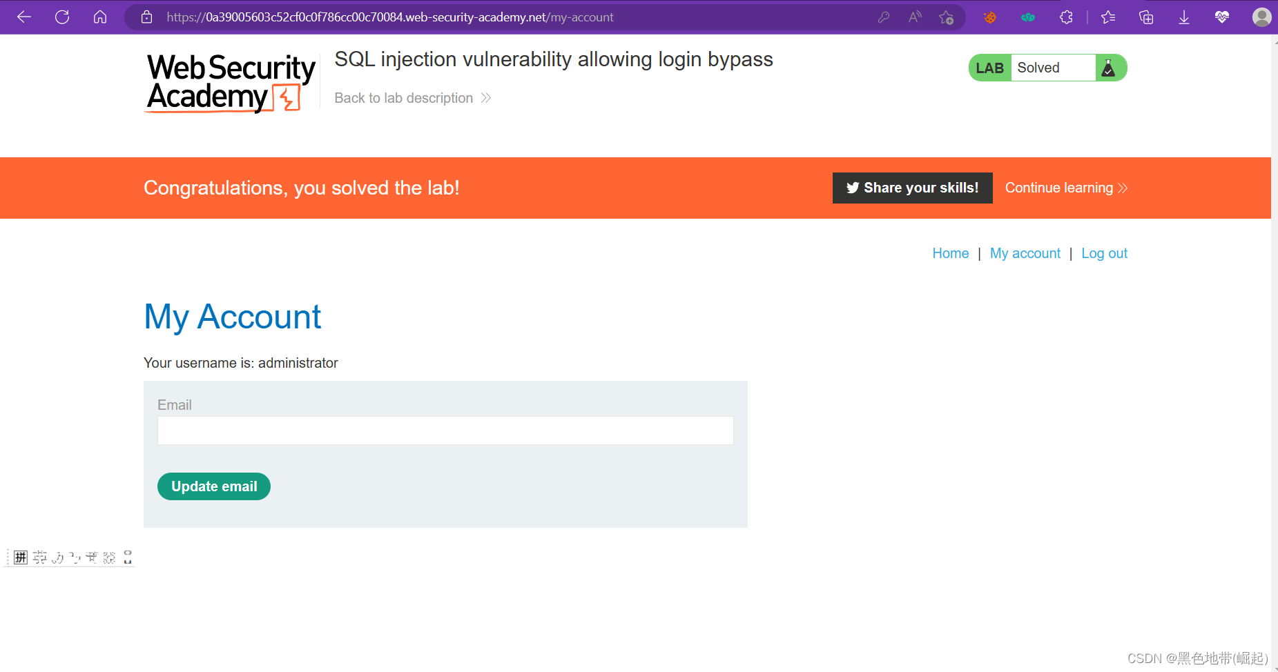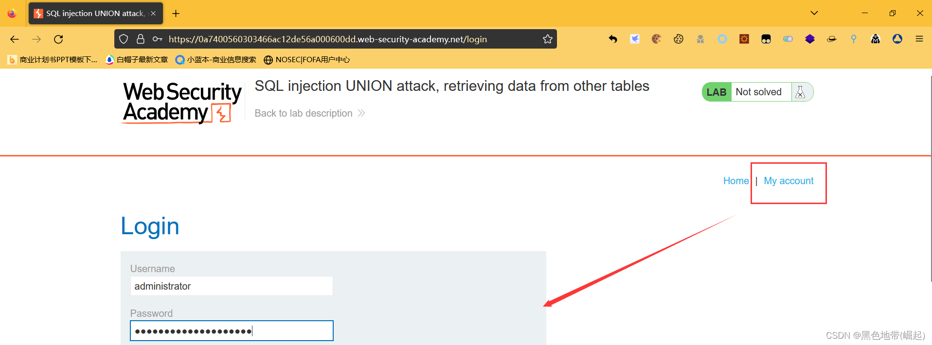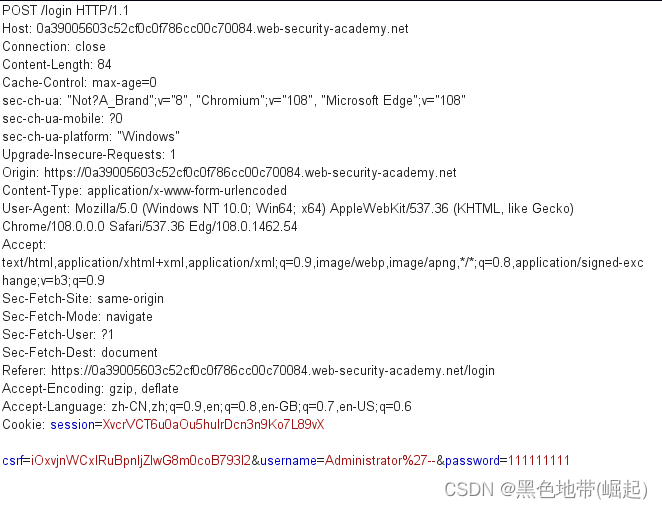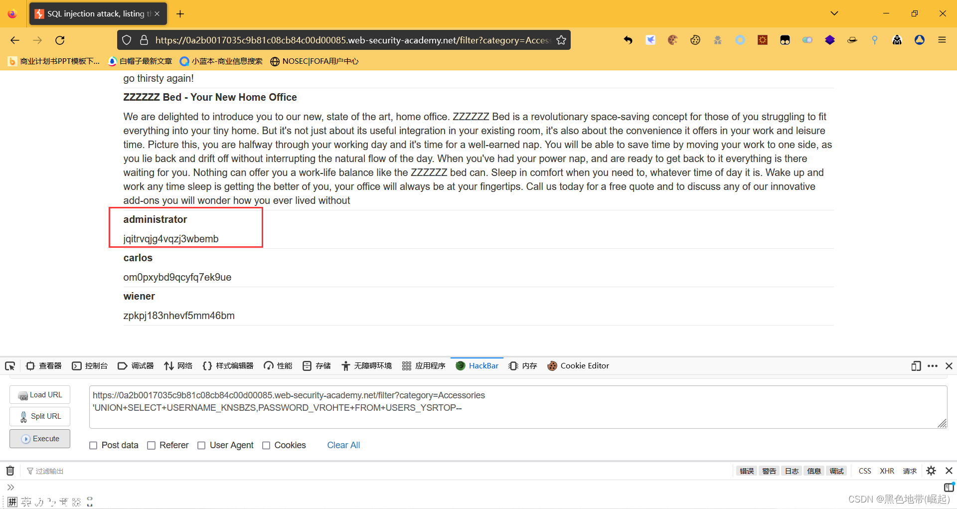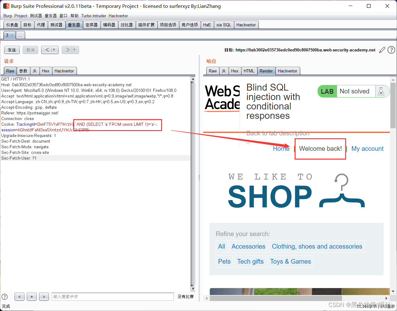 示例: 如果用户提交用户名和密码 执行SQL 查询来检查凭据:(wiener bluecheese) SELECT * FROM users WHERE username = 'wiener' AND password = 'bluecheese' 如果查询返回用户的详细信息,则登录成功。否则,将被拒绝注入: 使用 SQL 注释序列从查询子句中删除密码检查,即可在没有密码的情况下以任何用户身份登录 如提交用户名+空白密码(--WHEREadministrator'--) SELECT * FROM users WHERE username = 'administrator'--' AND password = '' 此查询返回用户名为administrator的用户,并成功将攻击者登录到该用户。实验2:登陆逻辑