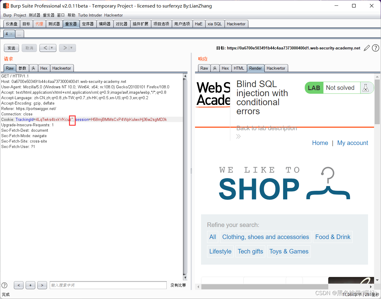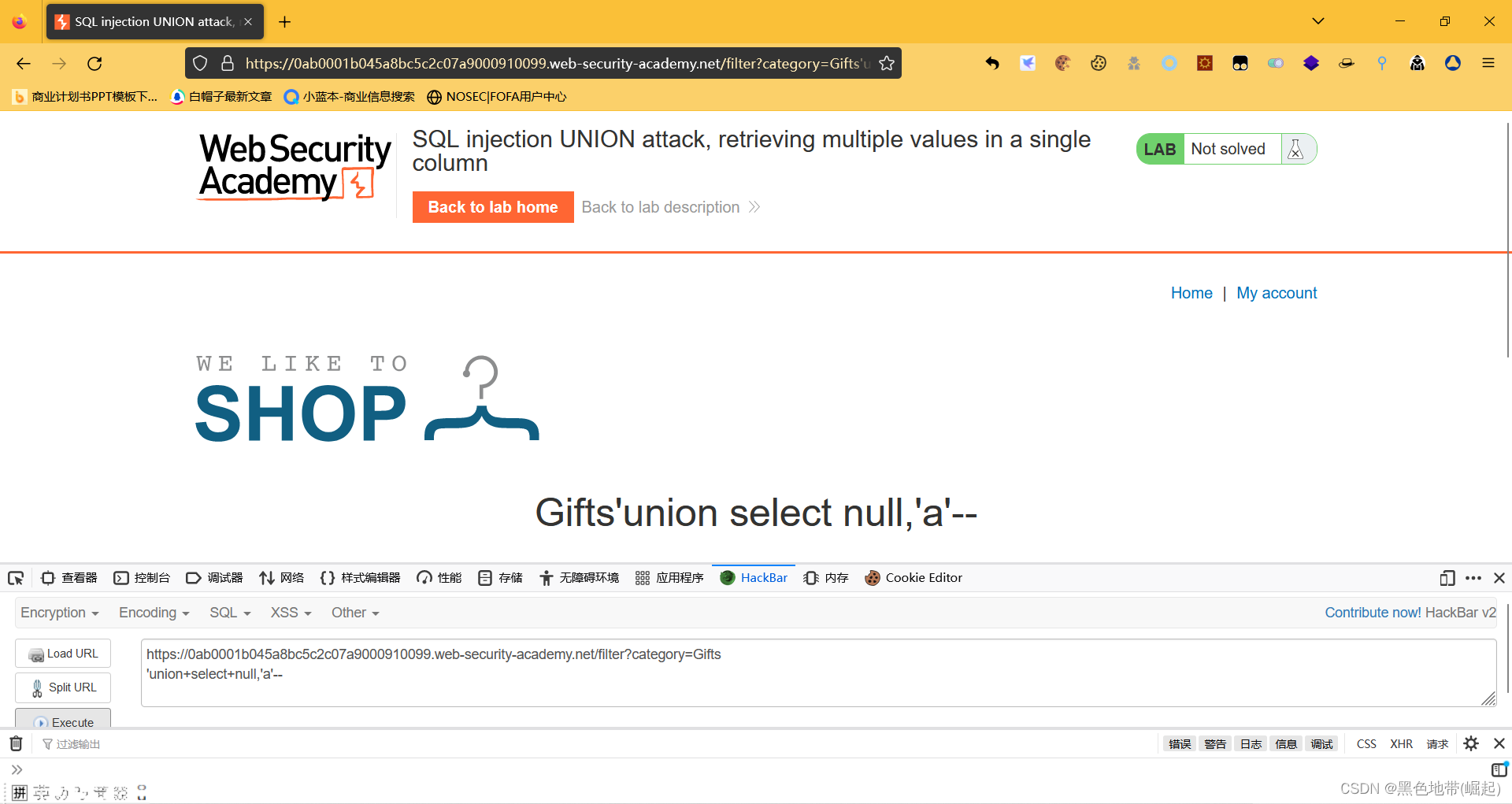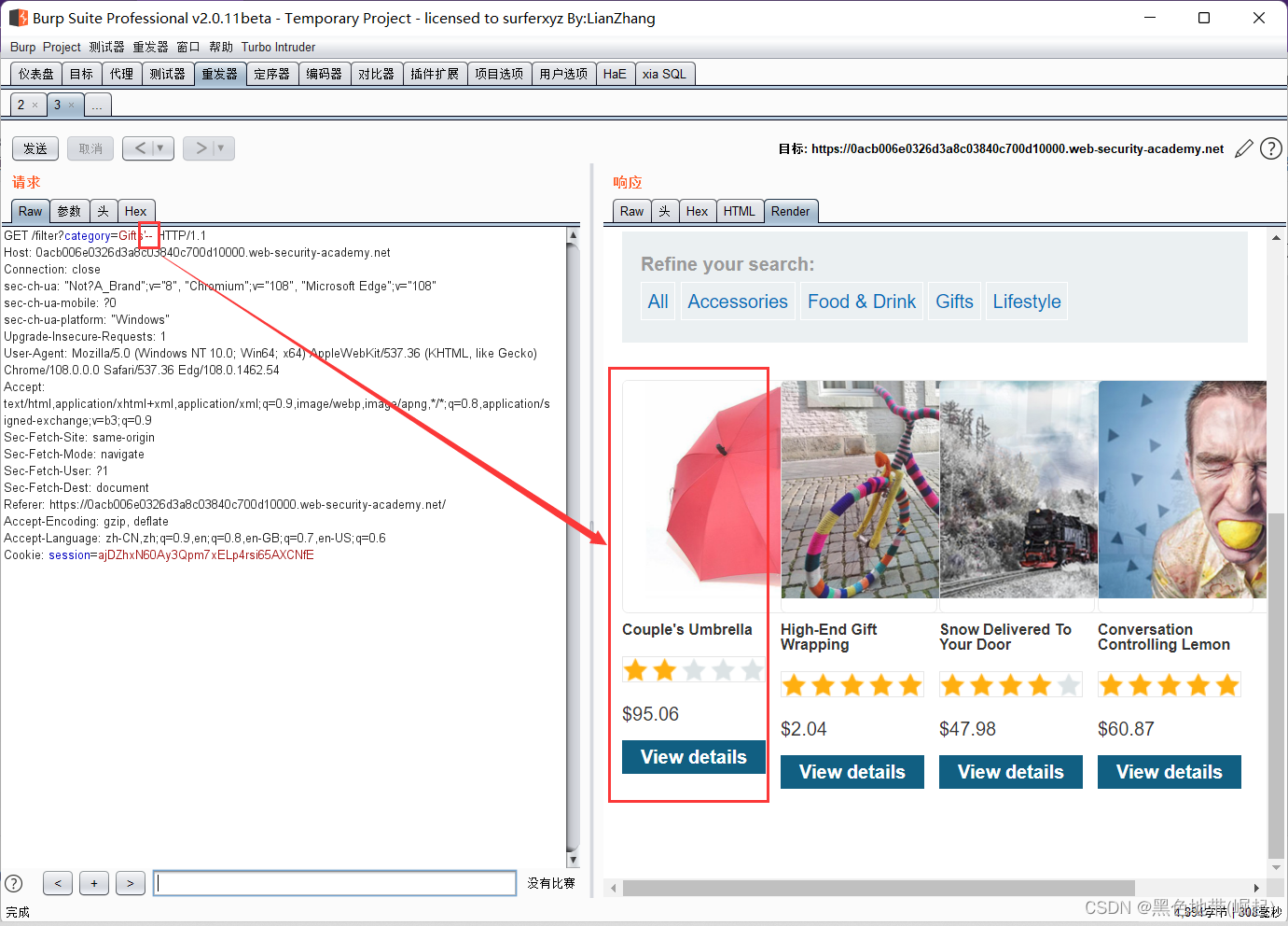 示例: 一个显示不同类别产品的购物应用程序。当用户单击“礼品”类别时,其浏览器会请求 URL: https://insecure-website.com/products?category=GiftsSQL查询,以从数据库中检索相关产品的详细信息: SELECT * FROM products WHERE category = 'Gifts' AND released = 1此 SQL 查询要求数据库返回: 所有详细信息 (*) 从产品表 其中类别为礼品 并释放是 1该限制用于隐藏未发布的产品。对于未发布的产品,大概为released = 1 released = 0注入: 构建如下攻击('--) https://insecure-website.com/products?category=Gifts'--将导致 SQL 查询: SELECT * FROM products WHERE category = 'Gifts'--' AND released = 1 后面查询的其余部分将被删除(--AND released = 1),意味着将显示所有产品,包括未发布的产品攻击者可以使应用程序显示任何类别中的所有产品,包括他们不知道的类别: https://insecure-website.com/products?category=Gifts'+OR+1=1--将导致 SQL 查询: SELECT * FROM products WHERE category = 'Gifts' OR 1=1--' AND released = 1 将返回类别为“礼物”或 1 = 1 的所有(始终为 true)实验1:隐藏商品