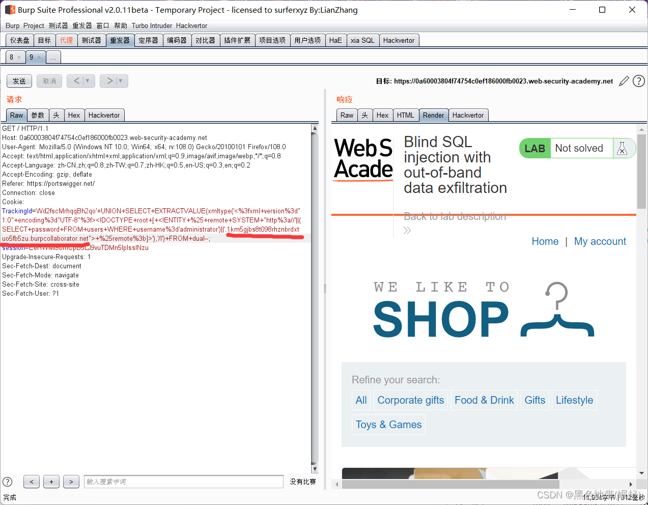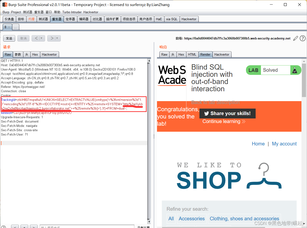 漏洞识别: 1、请注意,库存检查功能以 XML 格式将 productId和 storeId发送到应用程序。 2、将POST /product/stock请求发送到bp中继器。 3、在 Burp 中继器中,探测storeId 以查看是否评估了您的输入。例如,尝试将 ID 替换为计算结果为其他潜在 ID 的数学表达式,例如:1+1 4、观察您的输入似乎由应用程序评估,返回不同商店的库存。 5、尝试通过将语句追加到原始存储 ID 来确定原始查询返回的列数:UNION SELECT1 UNION SELECT NULL 6、请注意,请求由于被标记为潜在攻击而被阻止。绕过 WAF: 1、在注入 XML 时,请尝试使用 XML 实体对有效负载进行模糊处理。一种方法是使用 Hackvertor 扩展。只需突出显示您的输入,右键单击,然后选择 Hackvertor >扩展>编码 > dec_entities/hex_entities。 2、重新发送请求,并注意您现在收到来自应用程序的正常响应。这表明您已成功绕过 WAF。漏洞利用: 1、从上次中断的地方继续,并推断查询返回单个列。当您尝试返回多列时,应用程序将返回0 units ,这意味着错误。 2、由于只能返回一列,因此需要连接返回的用户名和密码,例如:<@hex_entities>1 UNION SELECT username || '~' || password FROM users<@/hex_entities> 3、发送此查询并观察是否已成功从数据库中获取用户名和密码(用字符分隔)。~ 4、使用管理员的凭据登录并解决实验室问题