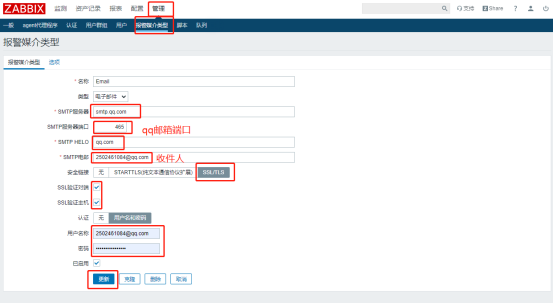 3. 管理→报警媒介类型→email→添加SMTP服务器:smtp.qq.com→端口:465→HELO:qq.com→SMTP电邮:2502461084@qq.com→SSL/TLS→勾选→用户名称:2502461084@qq.com→密码:qq邮箱授权码。