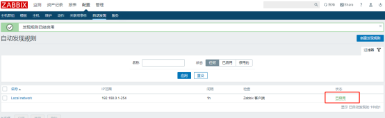 (1)配置→自动发现→修改Local Network→添加主机网段(agent端范围,IP数越多时间越久)→修改间隔→更新。
