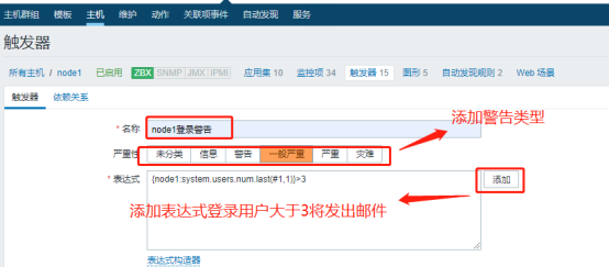 配置→主机→找到对应主机(node1)→触发器→创建触发器→命名→严重性→添加表达式→选择监控项(Number of logged in users)→间隔→结果(大于/0小于/等于/不等于n则发出警告)→下方添加完成。