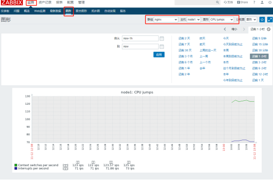 点击监测→图形→选择群组→主机→监控类型,就可以看到当前被监控端的信息,但是可以看到下方数据有乱码现象,需要在zabbix服务器安装字体包。