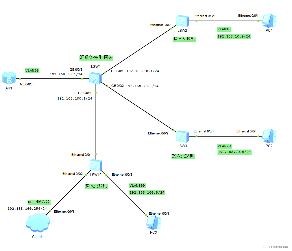 [SW1]vlan batch 10 20 30 100# 设置 VLAN 为 Trunk