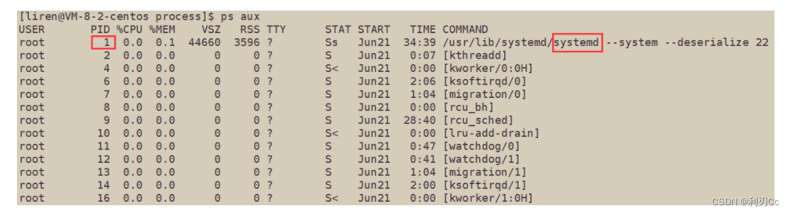操作系统启动之前是有 0号进程的,只不过完全启动成功后,0号进程就被1号进程取代了,具体的取代方案,后面学习 进程替换时再谈。可以看到 pid 排名靠前的进程都是由 root 来启动的。注意在 Centos7.6 下,它的 1号进程 叫做 systemd,而 Centos6.5 下,它的 1号进程 叫做 initd。