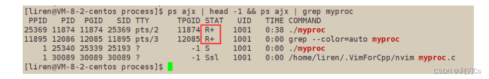 运行后我们用 ps ajx 来查看一下进程状态,这里的 STAT 代表的就是进程状态,这里的 R+ 就是运行状态,至于 + 号是什么意思,下面会解释!