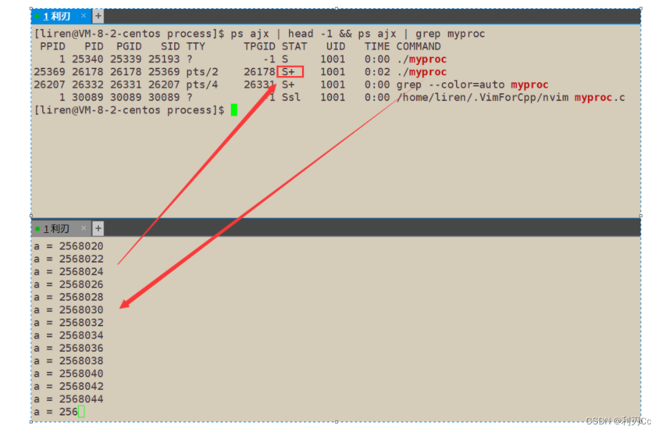 运行并查看进程,当前进程状态处于 S,叫做睡眠状态,睡眠状态也是阻塞状态的一种。因为 printf 要访问显示器,显示器是外设的一种,外设有个特点就是相较于 CPU 比较慢,慢就要等待显示器就绪,等待就要花较长的时间。我们这个程序可能只有万分之一的时间在运行,其它时间都在休眠,站在用户的角度它是 R,但是对于操作系统来说它不一定是 R,它有可能在队列中等待调度。