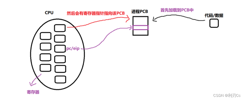 比如当我们在执行该进程的某条指令的时候,会有一个寄存器叫做 pc/eip 指向 当前正在执行指令的下一条指令的地址!