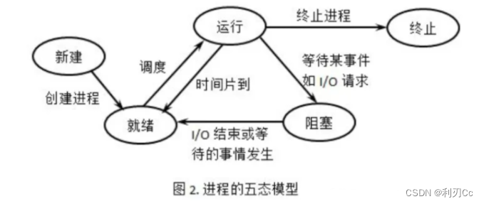 在五态模型中,进程状态分为 新建态、终止态,运行态,就绪态,阻塞态。