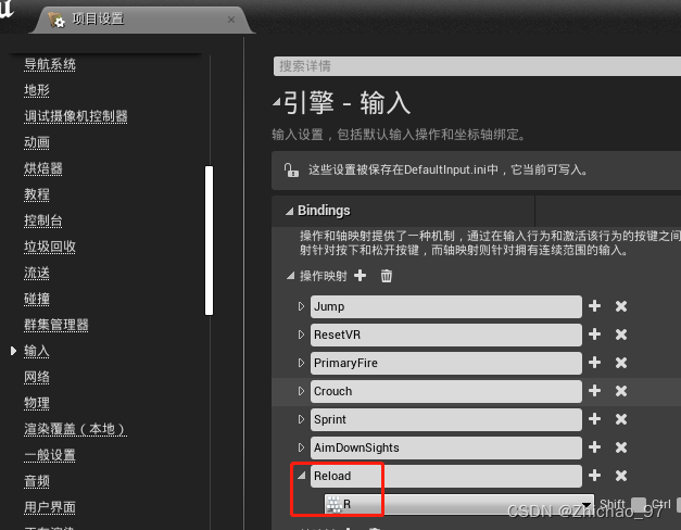 3.在项目设置中设置重新换弹匣的操作映射如下