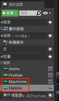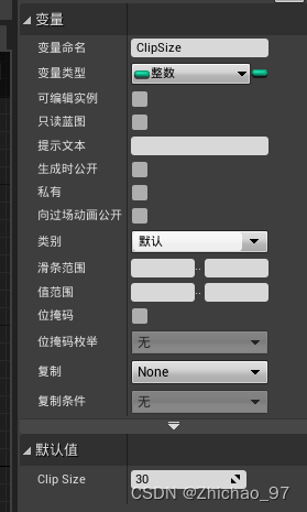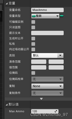1.打开“Weapon_Base”,添加两个整数类型变量,分别命名为“MaxAmmo”和“ClipSize”,表示最大载弹量和每次重新装弹的弹药量