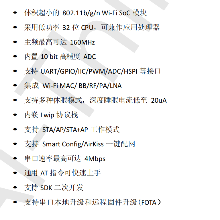 esp8266是一种无线网络设别,内部集成常用的网络配置,只要不是太精密的产品,是都可以应用的。同时他本身就是一个MCU,在没有其他外在MCU的情况下也是可以开发使用的。当然,这只是其中一款而已。具体的产品特性如下: