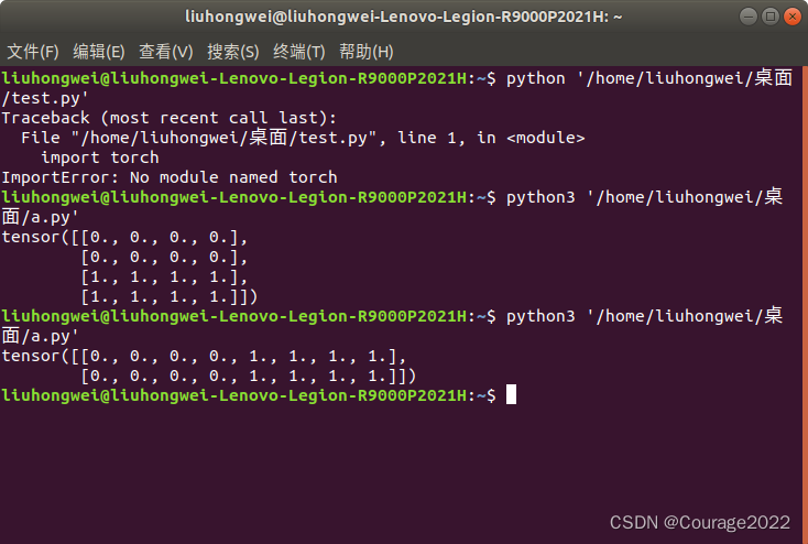 import torcha = torch.zeros((2,4)) b = torch.ones((2,4))out = torch.cat((a,b),dim = 0) print(out)