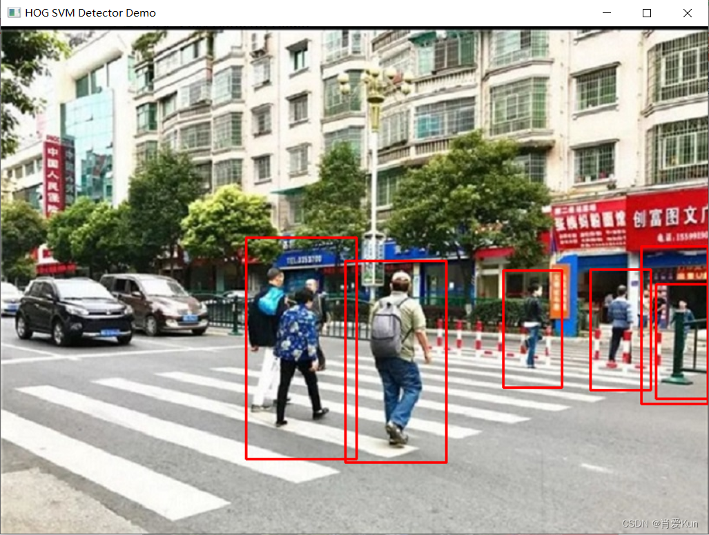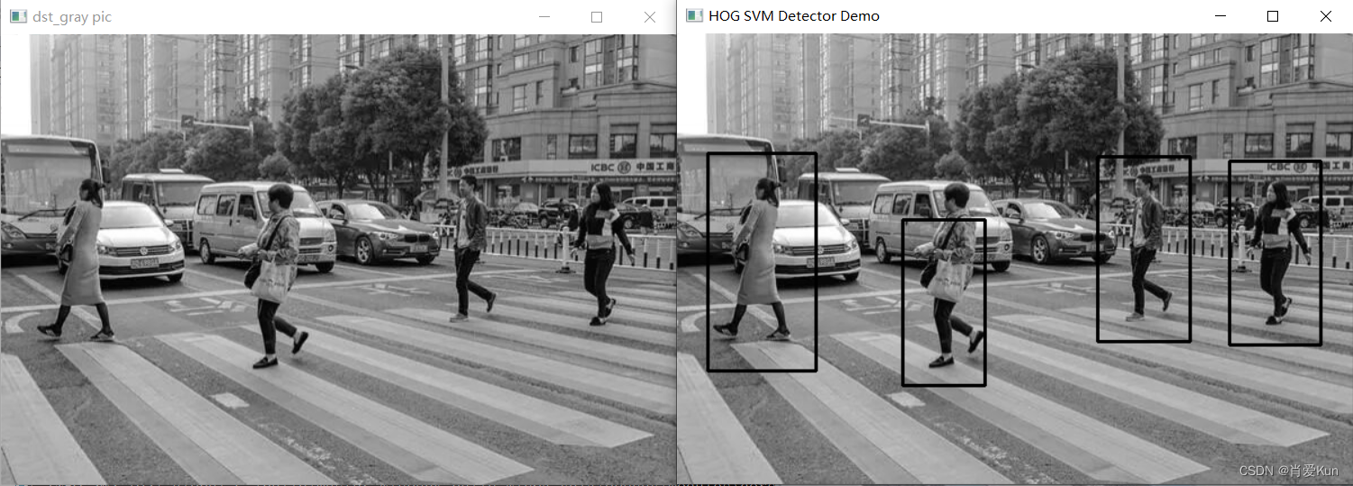 //using namespace cv::features2d;int main(int argc, char** argv) {Mat src = imread("F:/photo/h1.jpg");if (src.empty()) {printf("could not load image...\n");return -1;}namedWindow("input image", WINDOW_AUTOSIZE);imshow("input image", src);/*Mat dst, dst_gray;resize(src, dst, Size(64, 128));cvtColor(dst, dst_gray, COLOR_BGR2GRAY);HOGDescriptor detector(Size(64, 128), Size(16, 16), Size(8, 8), Size(8, 8), 9);vector descriptors;vector locations;detector.compute(dst_gray, descriptors, Size(0, 0), Size(0, 0), locations);printf("number of HOG descriptors : %d", descriptors.size());*/HOGDescriptor hog = HOGDescriptor();hog.setSVMDetector(hog.getDefaultPeopleDetector());vector foundLocations;hog.detectMultiScale(src, foundLocations, 0, Size(8, 8), Size(32, 32), 1.05, 2);Mat result = src.clone();for (size_t t = 0; t < foundLocations.size(); t++) {rectangle(result, foundLocations[t], Scalar(0, 0, 255), 2, 8, 0);}namedWindow("HOG SVM Detector Demo", WINDOW_AUTOSIZE);imshow("HOG SVM Detector Demo", result);waitKey(0);return 0;
