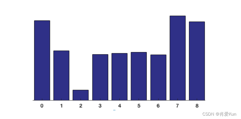 可以看到有很多值分布在0-180的bin里面,这其实也就是说明这个网格中的梯度方向很多都是要么朝上,要么朝下。把每个8*8的cell里面所有的像素点都分别加到这9个bin里面去,就构建了一个9-bin的直方图,上面的网格对应的直方图如下: