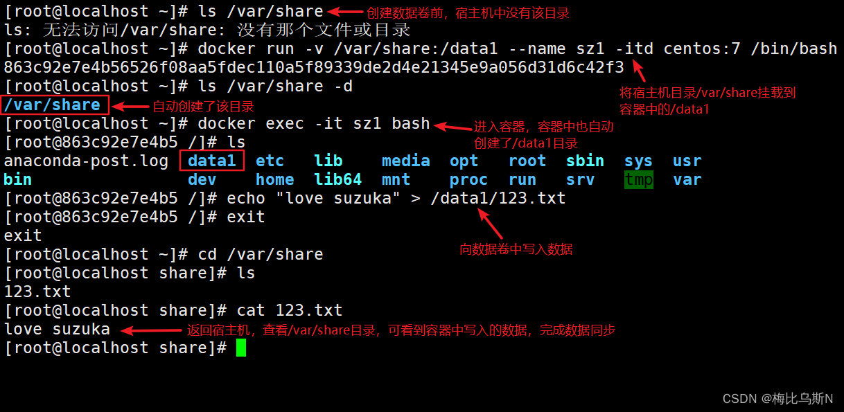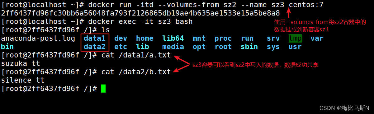 #创建数据卷容器sz2。创建/data1和/data2两个数据卷docker run -itd --volumes-from sz2 --name sz3 centos:7