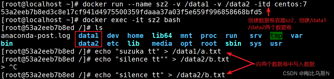 docker run --name sz2 -v /data1 -v /data2 -itd centos:7