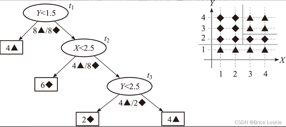 ,分支节点有。右边是每个数据点的坐标位置,有两种类型的数据点,分别为菱形和三角形。