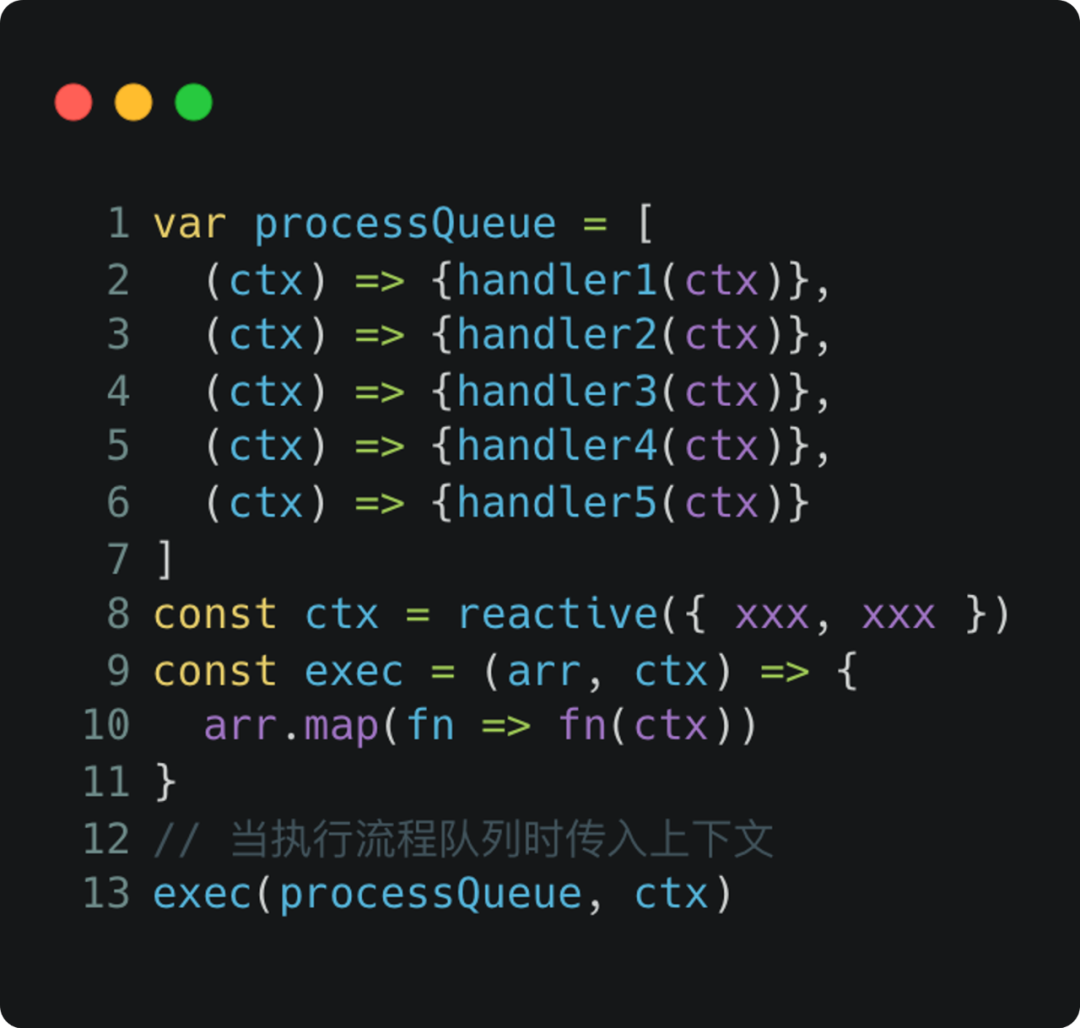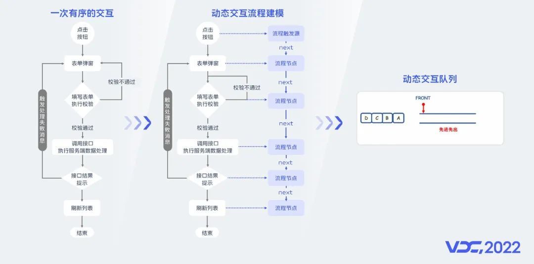 如上图所示,由用户点击按钮发起,弹出表单弹窗,填写表单,发起接口请求,根据响应结果提示和列表刷新,其中有的是用户交互,有的则是程序在驱动;我们通过对这样的动态交互流程建模,可以抽象出流程源和一个个流程节点;当用户触发交互,一个个交互节点组成了动态交互队列,有序执行,虽然实际情况可能会更复杂,有异步、有分支,但我们也仅仅通过不到30行的代码便实现了整个动态交互的驱动,我们把这个核心解决方案称之为动态交互解释器,如下图所示伪代码。