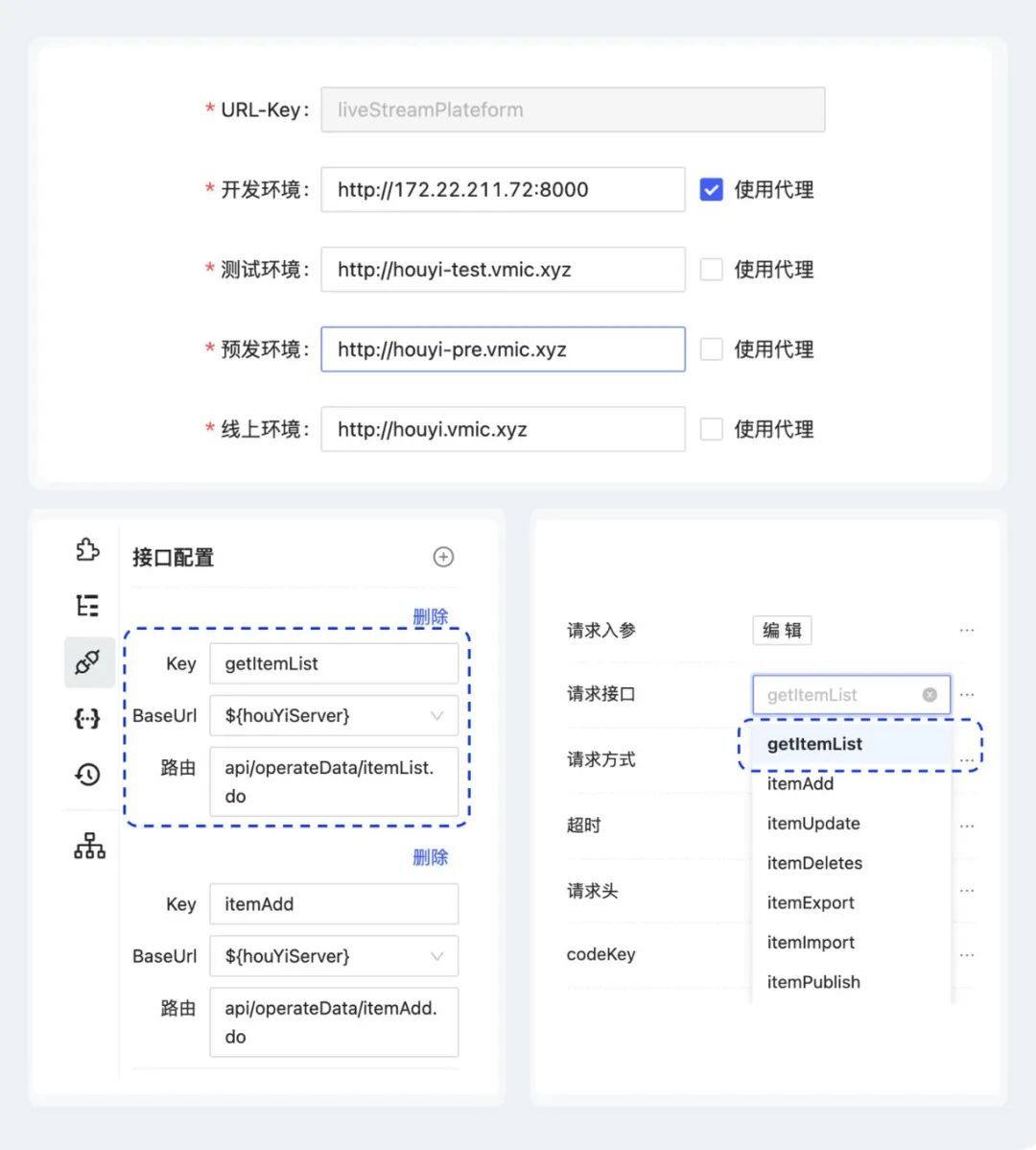 此外,我们还提供了一些贴心的功能:内置动态接口代理,一键开启后,即可连接本地或mock服务,开发调试非常方便;统一的服务配置入口,除了符合开发直觉, 也方便了系统层面的接口管理及复用,系统还会根据不同环境自动执行接口匹配。