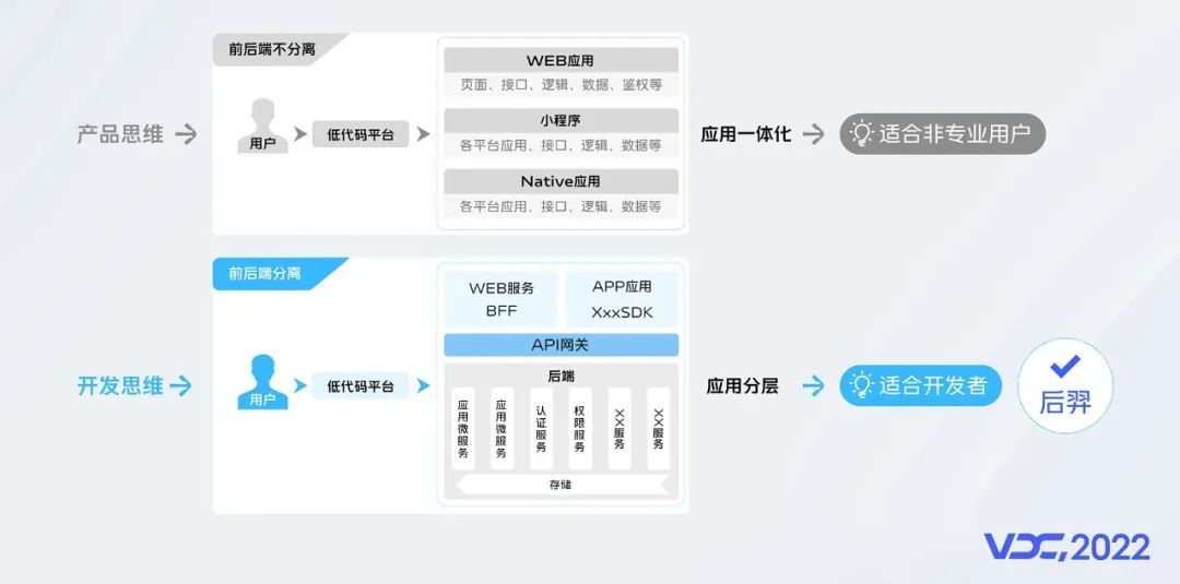 另一种则是开发视角,这种思维模式下,用户至少会看到前端和后端两种服务,这两种服务通常来说可能是页面和接口,这种模式更加适合程序员,与日常开发思维保持一致,所以平台学习成本也就很低,能够简单、快速的开发出更加复杂的应用;后羿主要面向开发者,自然而然的采用了这种分层开发的模式。