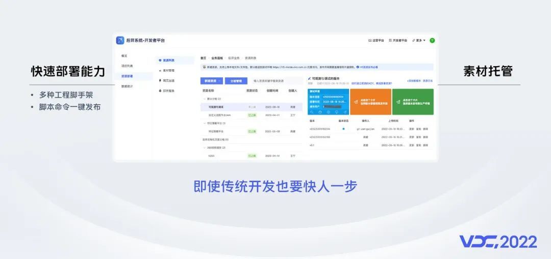 第二、 资源的管理与页面的可视化配置解耦,管理更加高效;如上图所示,除了可以随时拖拽调整菜单结构,还可以一目了然的看到资源的详细信息;得益于这种设计,我们提供了针对资源级别的版本发布功能,可以实现一键迭代及线上热更新;基于V消息的工单版本管理,安全高效可追溯,还能够实现秒级回退。